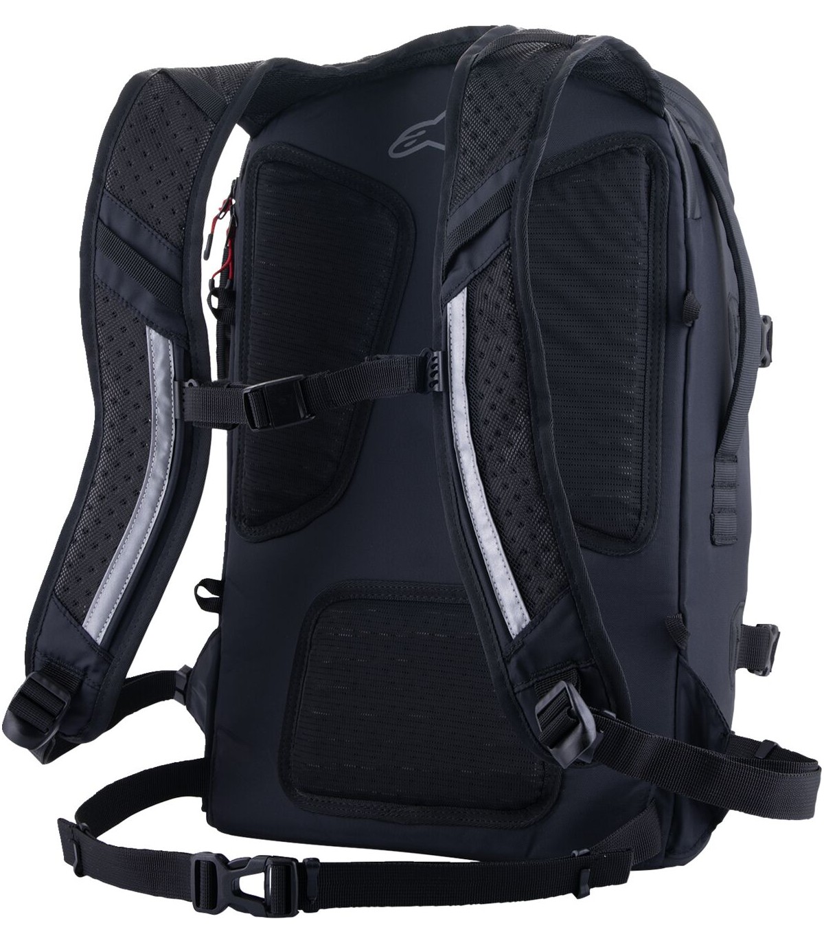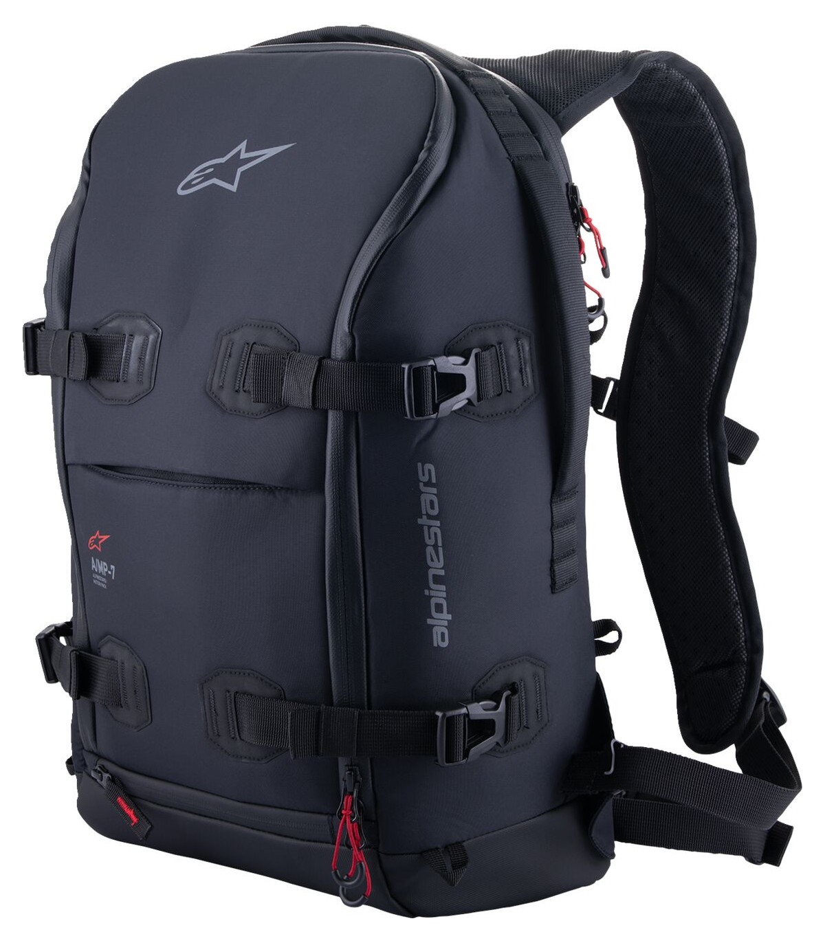 AMP-7 BackpackTechnical backpack designed for carrying all your important gear, keeping it safe, dry, and secure, both on and off the bikeIncludes a packable waist strap, chest strap with a magnetic buckle to help distribute the pack’s load when worn as well as conveniently open and close one-handed with gloves, back panel comfort pads, quick access front pocket, quick access external rain cover, internal zippered mesh pockets, adjustable position removable inner pouch, and a separate padded laptop compartmentFeatures an overall capacity of 22LConstructed from a tech fabric with structured, padded walls and lower body reinforcements to help maintain the bag’s shape, as well as full, long zippered openings for easy and wide accessWhether partially filled or completely packed, four compression straps that add extra security to the closure, stabilize the internal load, and allow the backpack to fit as comfortably and closely to the body as possible, while keeping the bag as aerodynamic as possibleThe two main shoulder straps are ergonomically shaped and padded with ventilated air holes to allow it to breathe well and fit comfortably for those long tripsThere are three convenient grab handles, to easy grab and to provide functional large anchor points to strap the bag down to the motorcycle for easier transportation