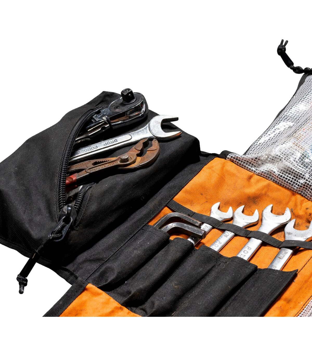 EXFIL-0 Tool RollBuilt to hold all the on-the-road essentials and still fit into Biltwell's EXFIL-7 bagInternal zipper pouch for small itemsHighly abrasion-resistant 600 denier polyester nylon outer shellHeavy-duty hi-vis orange nylon interior lining2 enclosed translucent rip-stop compartments and 1 larger "junk drawer" pocketIncludes 7 deep elastic socket holders and 5 angled wrench pocketsPockets engineered from more durable rip-stop fabricBundles together with expandable G-hook-and-loop nylon strap closureClosed dimensions 9.25” x 7.0"; 18.5” long when opened flatTools not included.