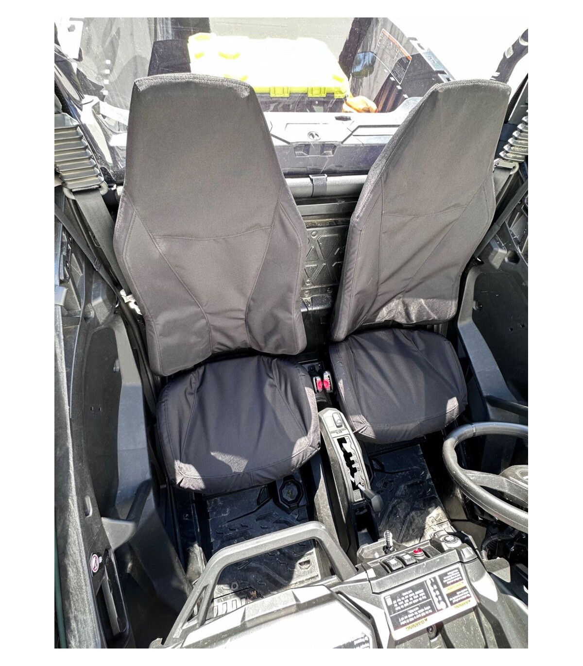 Seat CoverSeat covers are made from 600 denier urethane coated polyester and use elastic around outer edge to attach under seat bottom and seat backDurable water resistant coating on backsideUV resistance and heavyweight material make this a durable seat cover for daily useNeoprene side panels and heavy Velcro straps on back and sides of seat covers lock covers in place so they stay in position no matter how rough the trail getsGreat protection for factory seats with easy installation and no tools needed for a tight factory fitComes with all neccessary mounting items and instructionsCovers front or rear row of seatsMade in USA