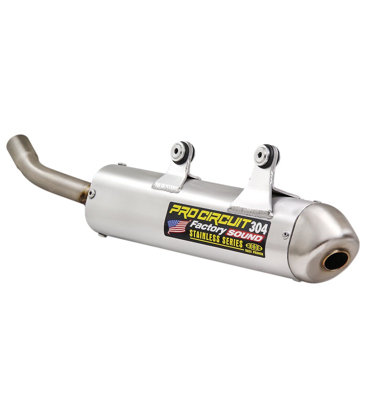 304 SilencerThe slightly longer body offers added top end performance while reducing noise outputLonger body design helps to reduce noise output6061 T6 brushed aluminum silencer bodyStainless steel inlet tube and end-capTig and mig welded for strength and durabilityDouble-walled mounting bracket(s)Allen head screws ensure easy repacking when needed for extended product lifeMade in the USA