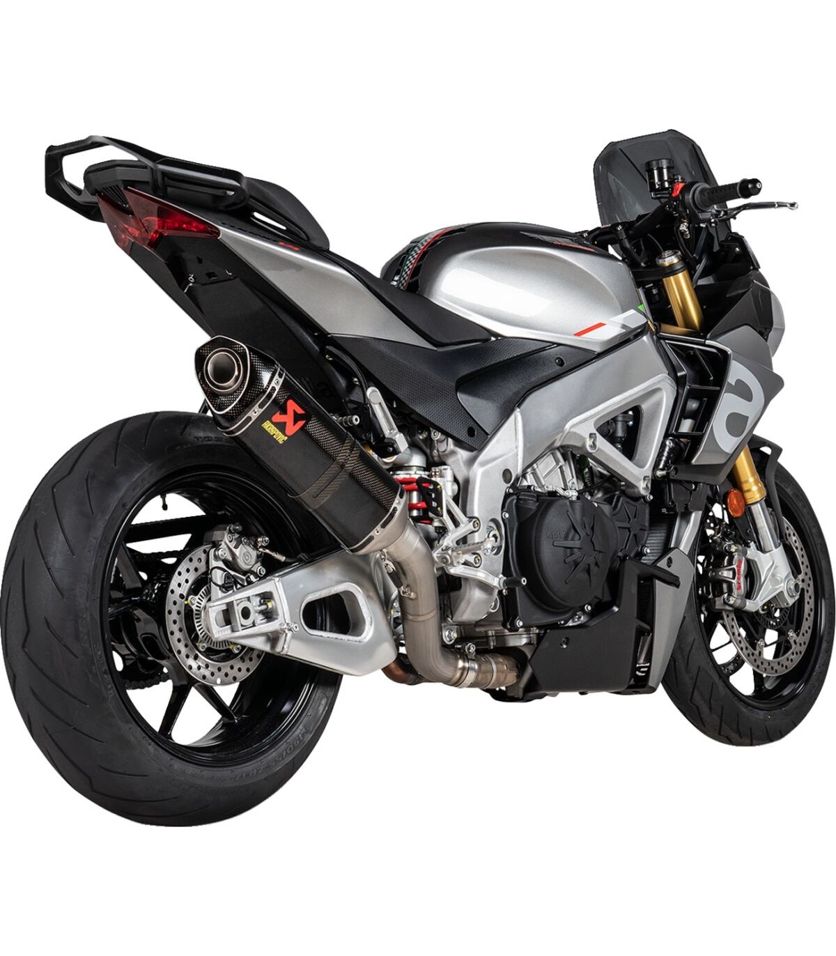 Slip-On Line MufflerRace-proven materials and sporty design have led to an exhaust that is the perfect introduction to the exhaust tuning processThe carbon-fiber muffler outer sleeve and end cap are stylishly shaped for a visual impact, and the use of lightweight titanium for the link pipe and inner structure means this system weighs in at 3.5 kg lighter than stock, for an impressive savings of 62.4%This exhaust has been developed for use on closed-course competition circuits, and it delivers track performance to match that demandTo match the performance and style, the Slip-On Line (Carbon) system serves up a deep and vivid sound, full of Akrapovic character, to totally encapsulate the Aprilia engineTo obtain optimum performance, throttle response, and durability, remapping is recommended