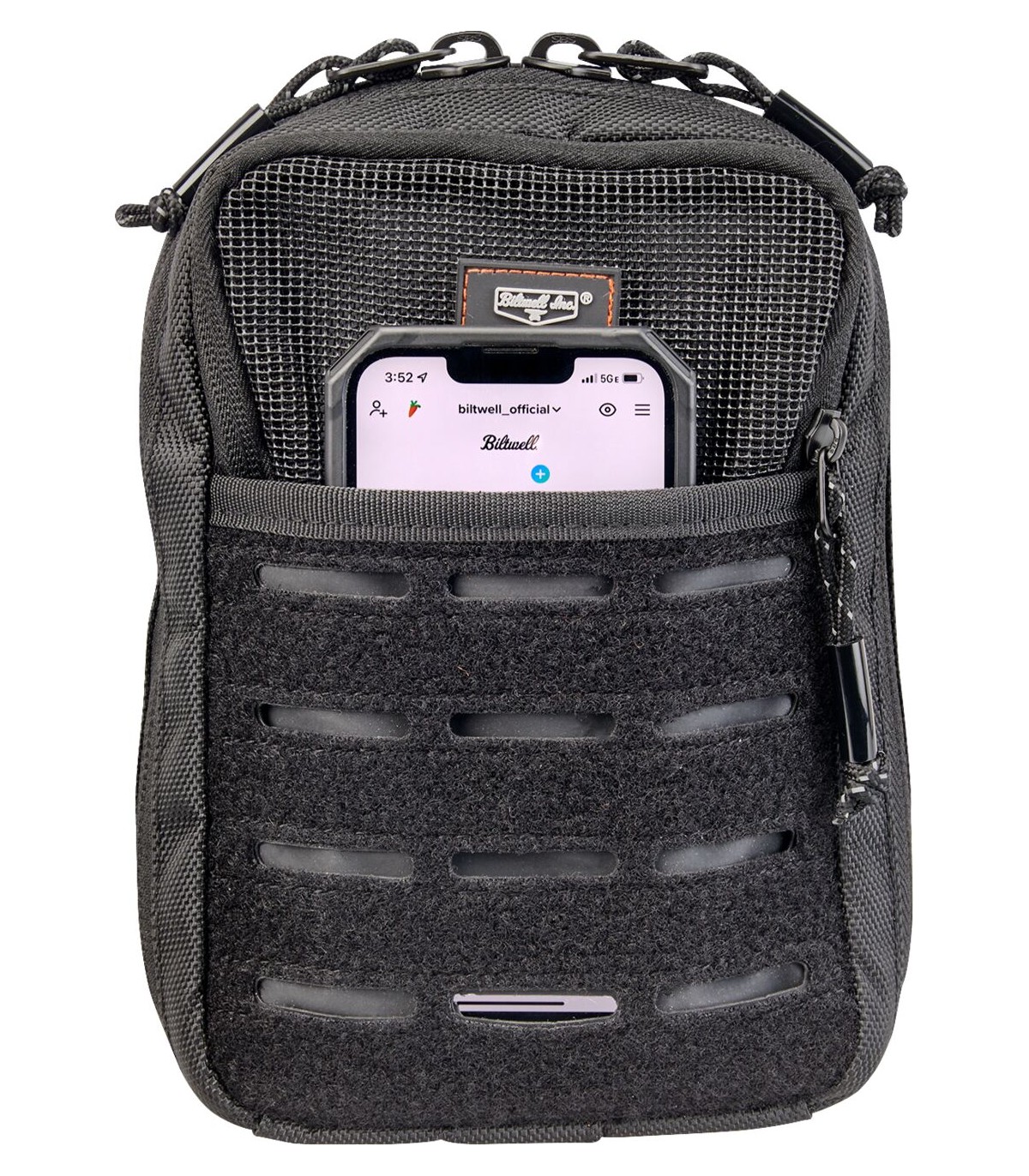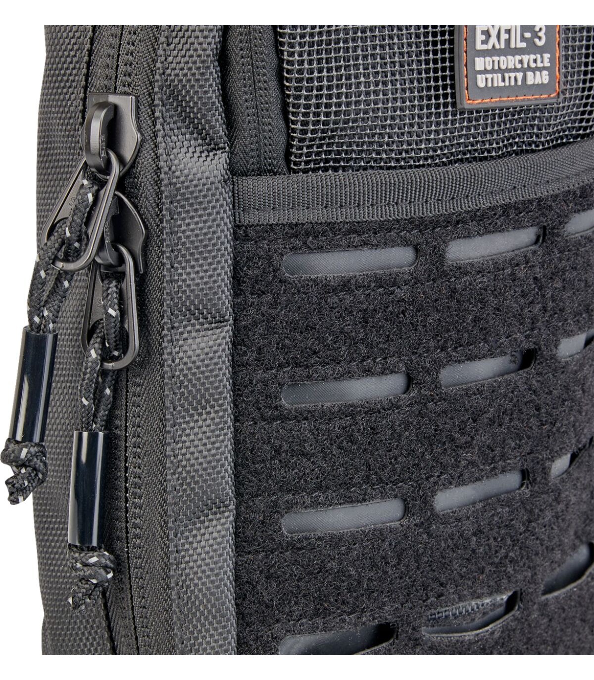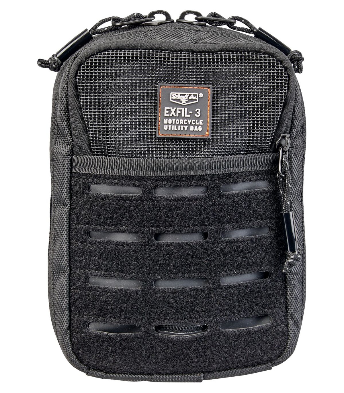 EXFIL-3 Bag 2.0Just the right size with multiple entry points for charging cords, fleece-lined interior pockets, easy-access exterior pockets and lots of MOLLEEXFIL-3 is the perfect motorcycle glove box for all your essential daily carry needsPractical bag designed to fit on motorcycles with tall risers or T-bars but can be attached practically anywhere using the 6 hook-and-loop straps includedUV-Treated 1680 ballistic polyester constructionMultiple, discreet cord pass-throughMesh outer pocket for easy accessHigh-quality zippers and pullsSix hook-and-loop mounting strapsFleece-lined interiorBuilt-in key loop with included carabiner
