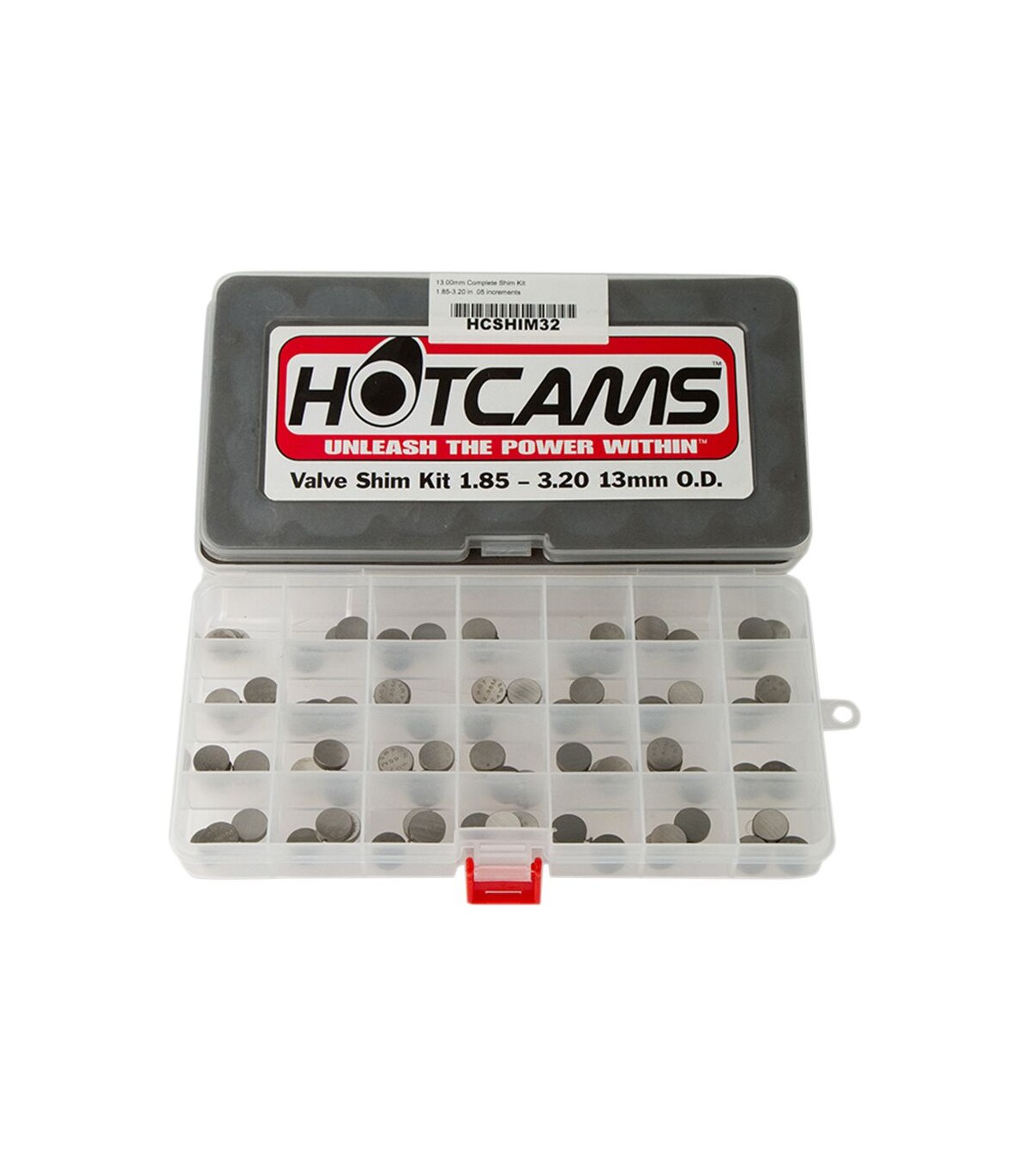 Complete Valve Shim KitForged from 4140 cold rolled steelHeat treated for improved stength and longevityLaser etched size on each shimKit includes three shims of each size from 1.85 mm to 3.20 mm thickness in 0.05 mm increments.