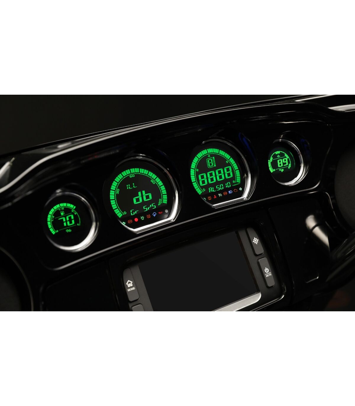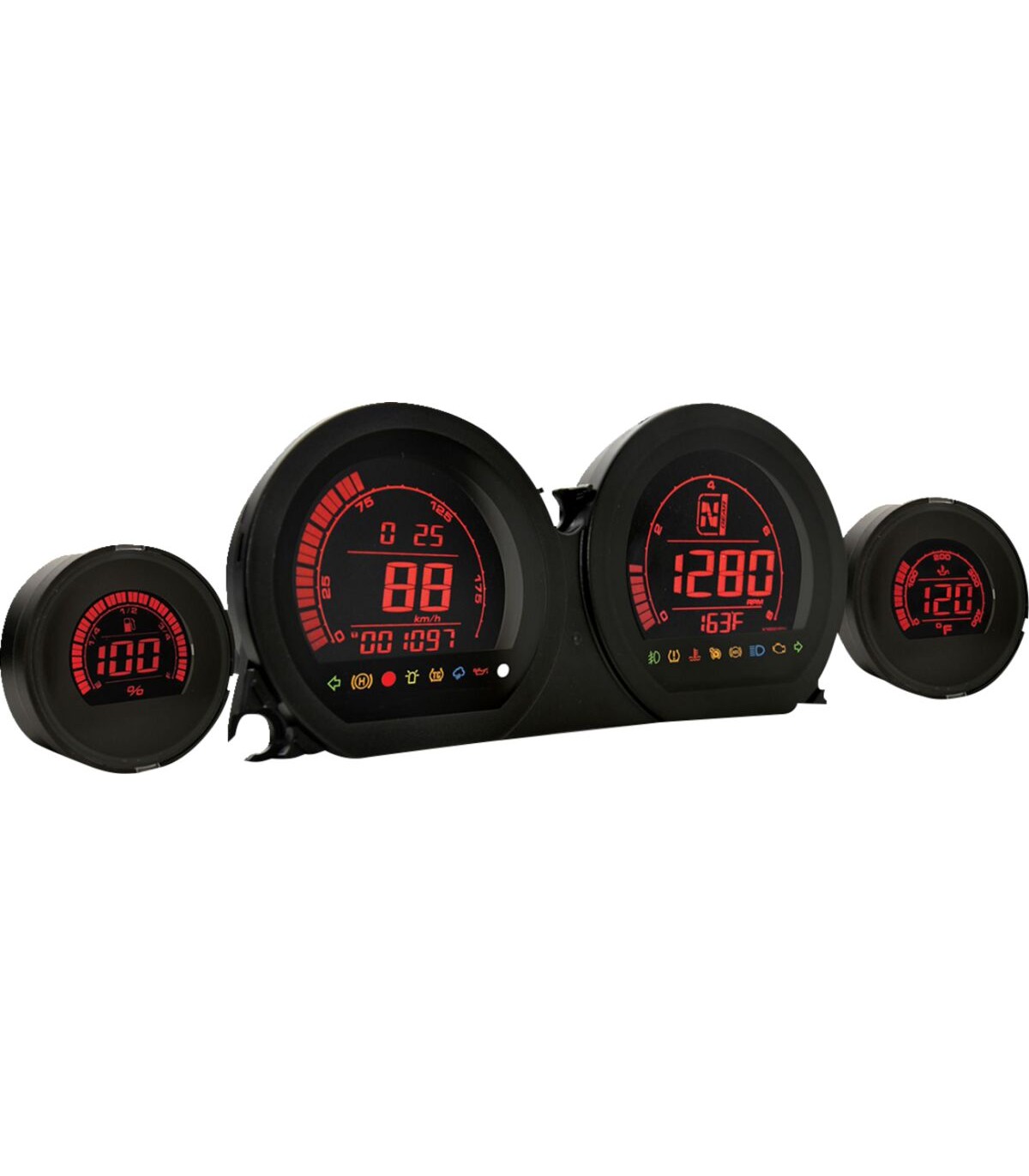 HD-03 - Four-Piece LCD Gauge KitPlug-and-playFits directly on OEM dash and connectorsColor changeable LCD displayIncludes speedometer, tachometer, odometer, gear indicator, tripmeter, engine temperature, oil temperature, and fuel level gaugesIndicator lights for oil, engine warning, warning light, high beam, fog light, and turn signalsSpecifications: Tachometer (0 - 9,999), RPM Shift Light (2,000 - 8,000 RPM), Maximum RPM (0 - 8,000 RPM)Speedometer (0 - 199 MPH), Maximum Speed Record (0 - 199 MPH), Overspeed Warning (19 - 199 MPH)Odometer (0 - 999,999 miles), Tripmeter A/B (0 - 9,999 miles), Mileage Maintenance (300 - 10,000 miles)Engine Temperature (Standard/Customize), Oil Temperature Meter (32° F - 248° F), Maximum Oil Temperature Record (32° F - 248° F), Effective Temperature Range (14° F - 140° F)Fuel Meter (6 levels | 1 level = 16.6%), Fuel Tank Volume (Off/1 - 9.9 US Gallons), Average Fuel Consumption (Off/MPG), Remaining Mileage (0 - 6,249 miles)Volt Meter (DC 8V - 18V), Effective Voltage (DC 12V)