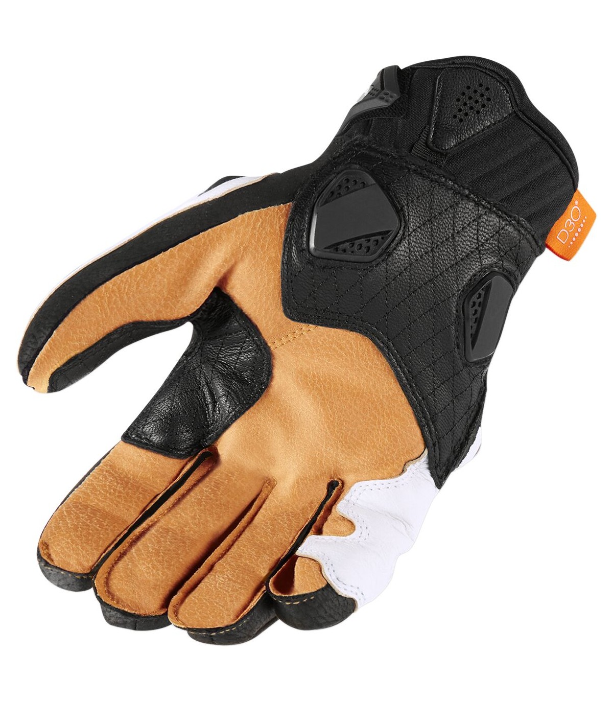 Hypersport™ Short GlovesAx® Laredo chassis is paired with goatskin palm overlays and diamond stitch accents located in areas of high wear from gripsPalm sliders guard against high-velocity asphalt encountersSuperior heat retaining materials with a focus on fit to provide ample range of motion, gives comfort on mild to colder riding daysICON® exclusive floating knuckle allows for maximum knuckle articulation and an out-seamed finger box and articulated fingers for all day comfortPerforated ventilation panels help keep hands cool and sweat freeFloating knuckle with D3O® underlay and offers dexterity and abrasion resistance with TPU finger platesFull knuckle coverage from vented TPU/polycarbonate knuckle plates
