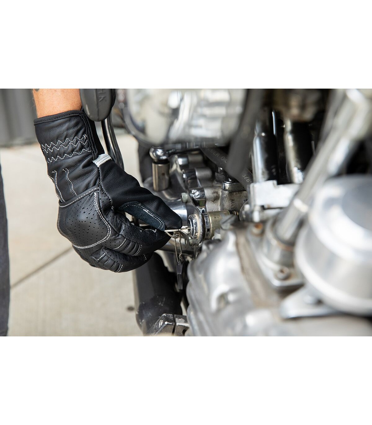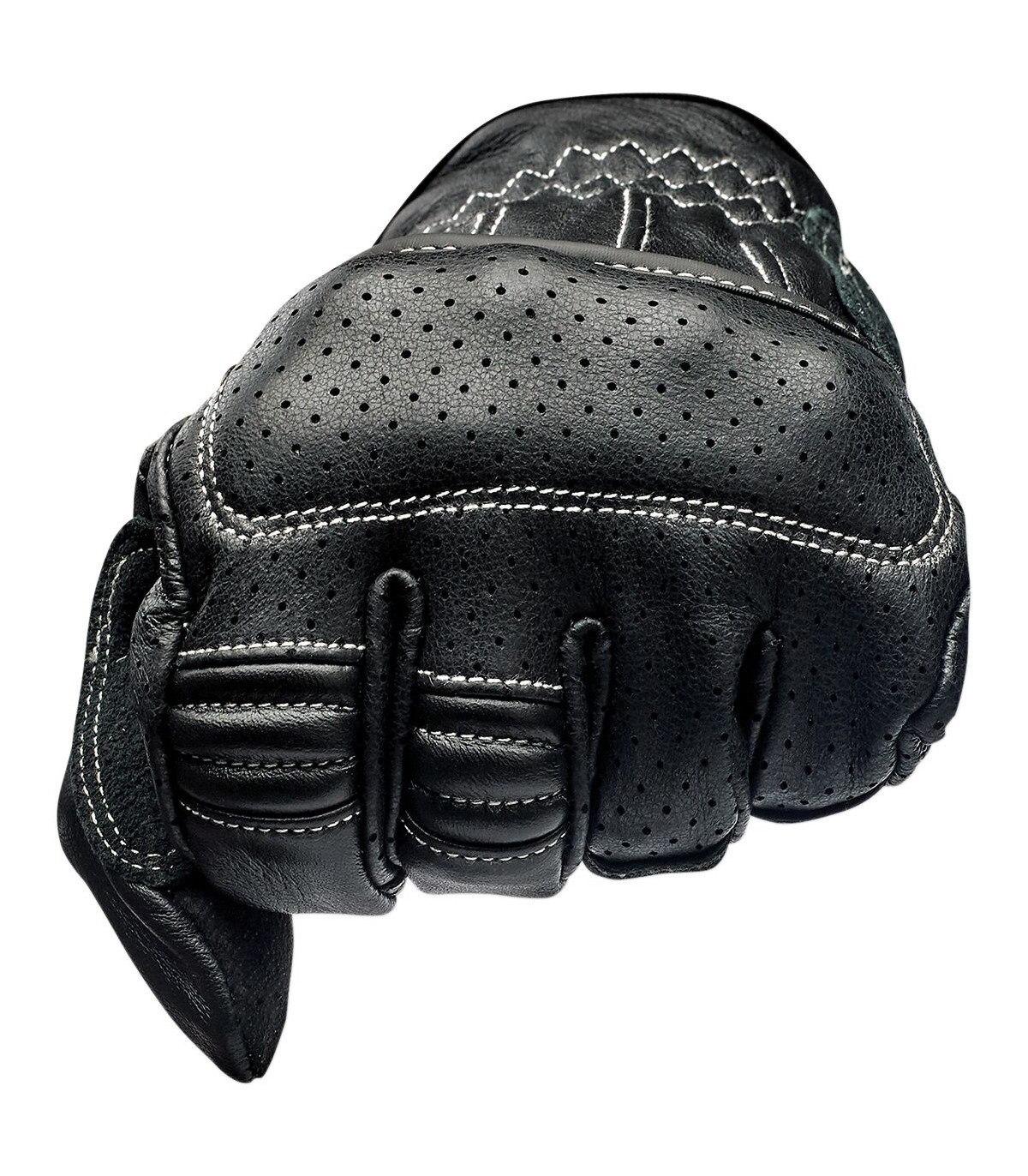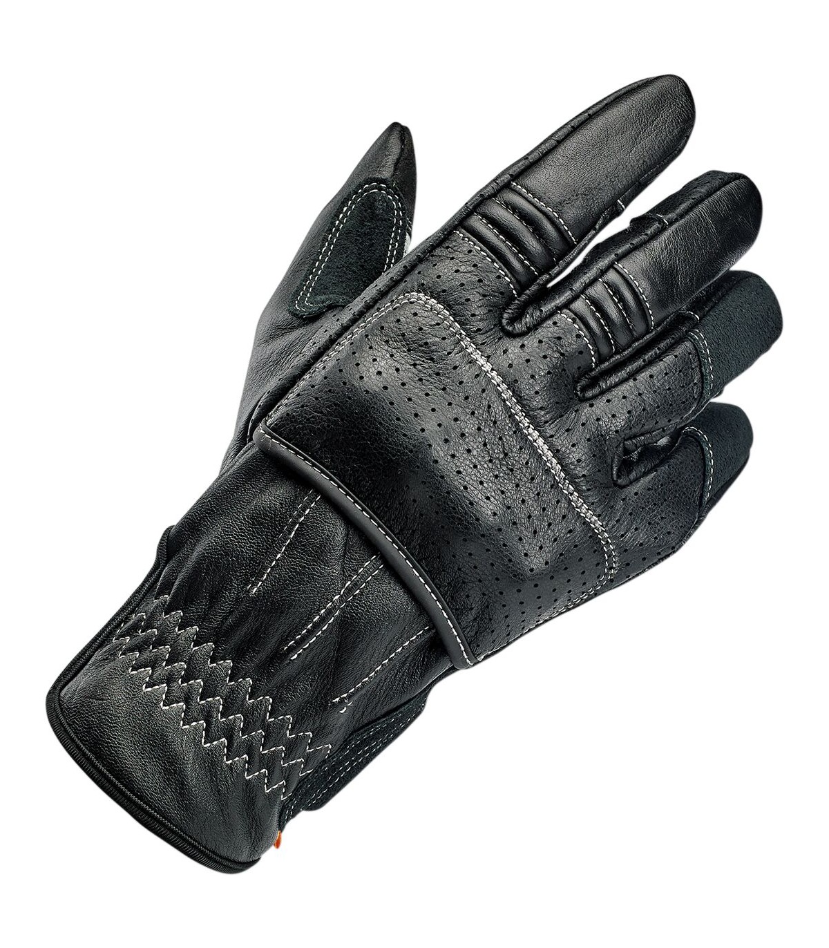 Borrego Gloves100% cowhide construction on exterior for durability and abrasion resistanceSuede friction zones with strategic padding for impact protectionMoisture-wicking fleece Lycra® half liner inside for breathability and comfortPerforated palm panels increase durability without compromising flexInternal padded high-impact plastic knuckle guardsWide elastic Velcro wrist closure with thermoplastic rubber Biltwell pull tabSmart screen-compatible thumb and fingertips
