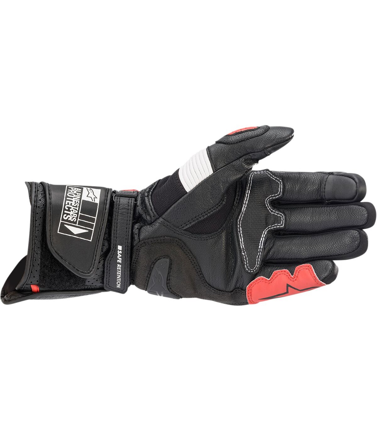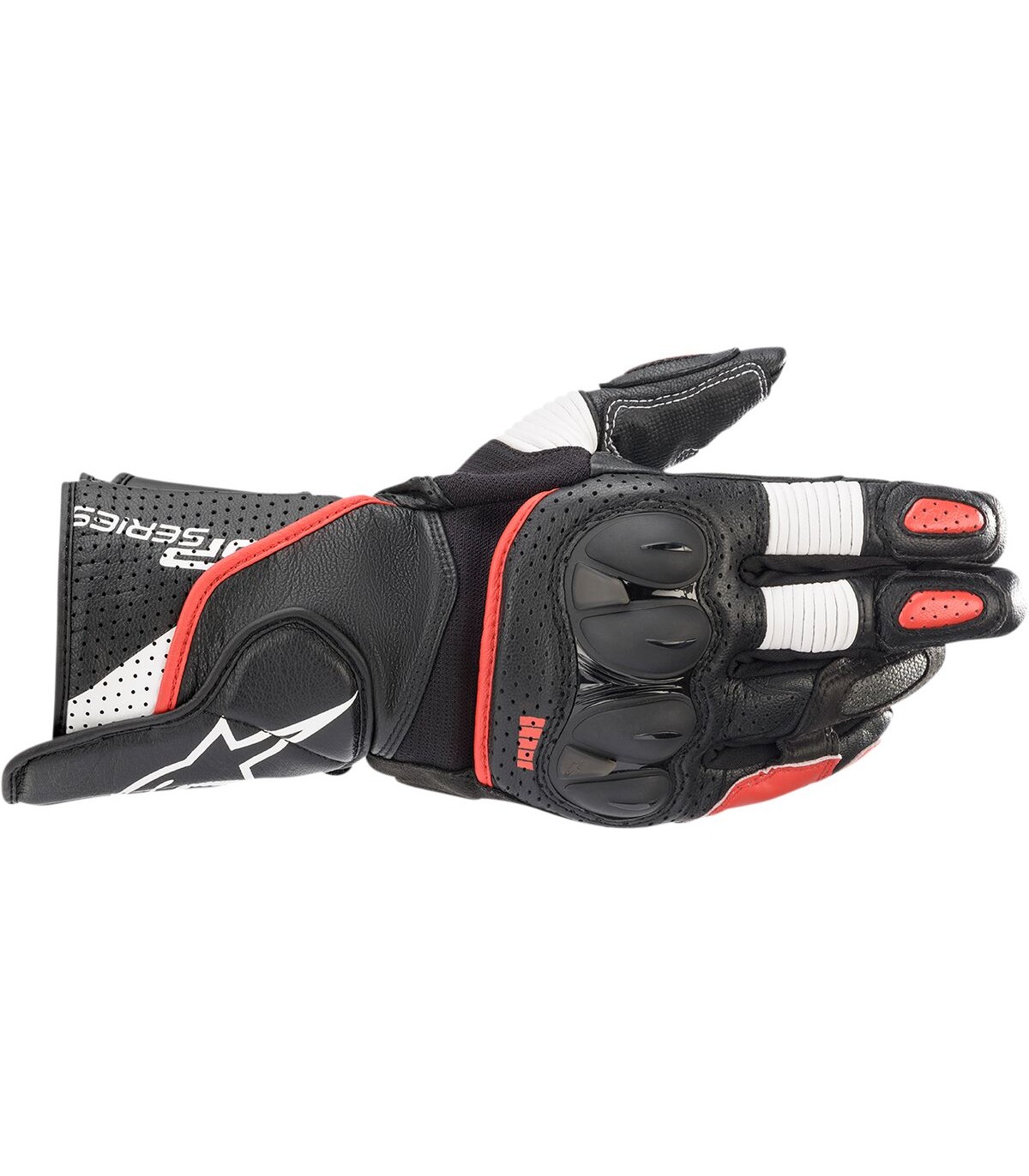 SP-2 v3 Leather GlovesConstructed from a supple and highly durable full-grain leather chassis to provide core abrasion resistance and durabilityPalm and finger sidewalls are reinforced with supple goat's leather for feel and performance fitMain shell reinforcement is provided by leather coverage over first and second fingers and cuffSynthetic suede reinforcements on palm and landing zones for maximum abrasion resistanceErgonomic, advanced compound and MotoGP-derived TPU slider on palm is backed with EVA foam for impact performanceAlpinestars' robust yet flexible compound knuckle guard provides exceptional impact and abrasion protectionStrategically positioned impact absorbing EVA foam for additional impact performanceAlpinestars' patented finger-bridge prevents excessive finger roll and separation during impactsExtensive sport knuckle gusset opening on thumb allows flex and freedom of movementPerforated cuff, leather top panel and ventilated finger sidewalls to help keep the hands coolCuff side leather padded patches to enhance protectionPre-curved finger construction reduces rider fatigueWide hook-and-loop wrist closure for easy entry and secure fasteningTouchscreen compatible fingertip area on index and thumb for use with smartphones and GPS systemsGloves EN 13594:2015