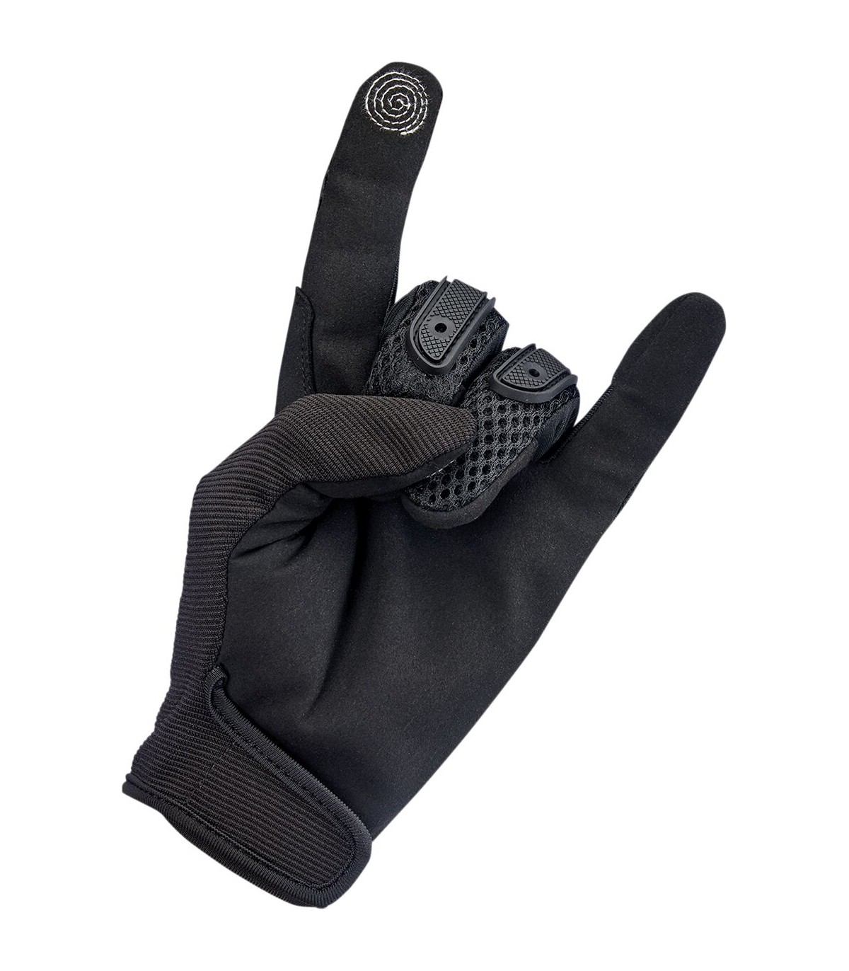 Anza GlovesSynthetic suede palm features two-way stretch for a snug, comfortable fitThree-ply, one-piece vented polyester back and thumb construction for maximum airflowFlexible thermoplastic rubber knuckle guards and shield logoLycra® expansion panels in finger joints for dexterityRugged Single- and double-needle polyester stitchingThermoplastic rubber knuckle guards on the back of the glove provide protection from rocky roost and airborne road debrisA double-stitched reinforcement panel on the thumb and index finger adds strength to the friction zone between your hands and the gripsConductive stitching in fingers and thumb lets you operate smart screens