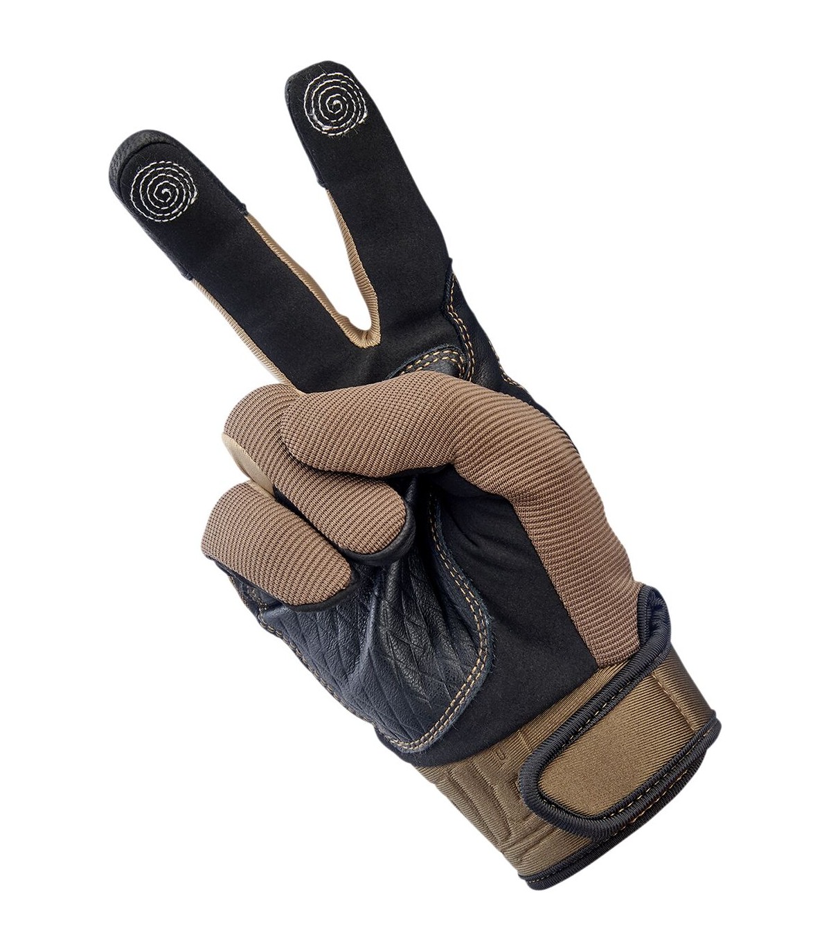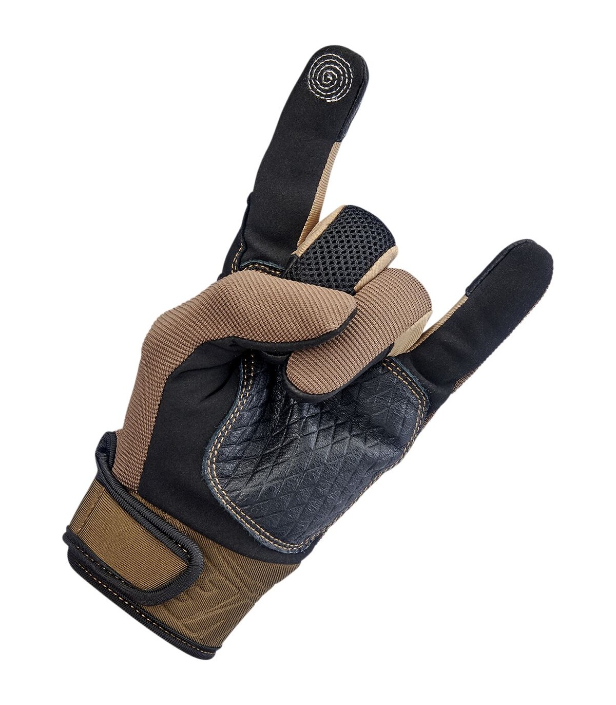 Baja GlovesDesign inspired by the 1980’s Golden Age of motocrossGoat leather palm and thumb reinforcement for added toughness in high friction areas with durable goatskin on fingertipsSynthetic suede palm and thumb construction for a snug, comfortable fitStretch polyester construction on ring and pinkie fingers for maximum flexibilityThree-ply woven mesh back panel for ventilationMolded two-ply neoprene wrist wrap with adjustable Velcro closureLycra® expansion panels in finger joints for added dexterityRugged single- and double-needle polyester stitching throughoutThermoplastic rubber lightning bolt knuckle protector5mm thick hidden neoprene knuckle guardConductive stitching in fingers and thumb lets you operate smart screen