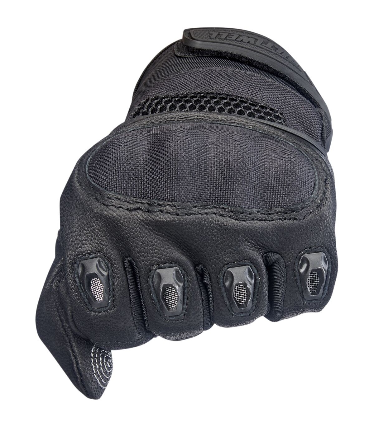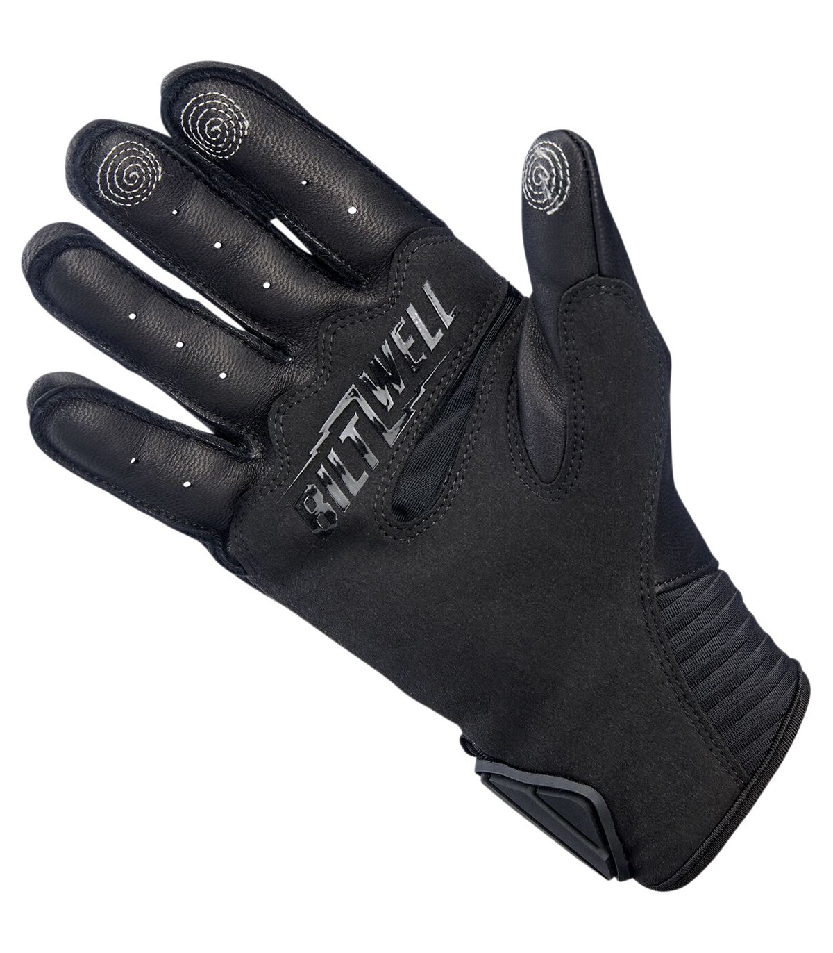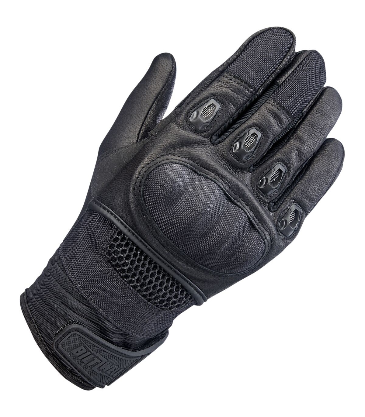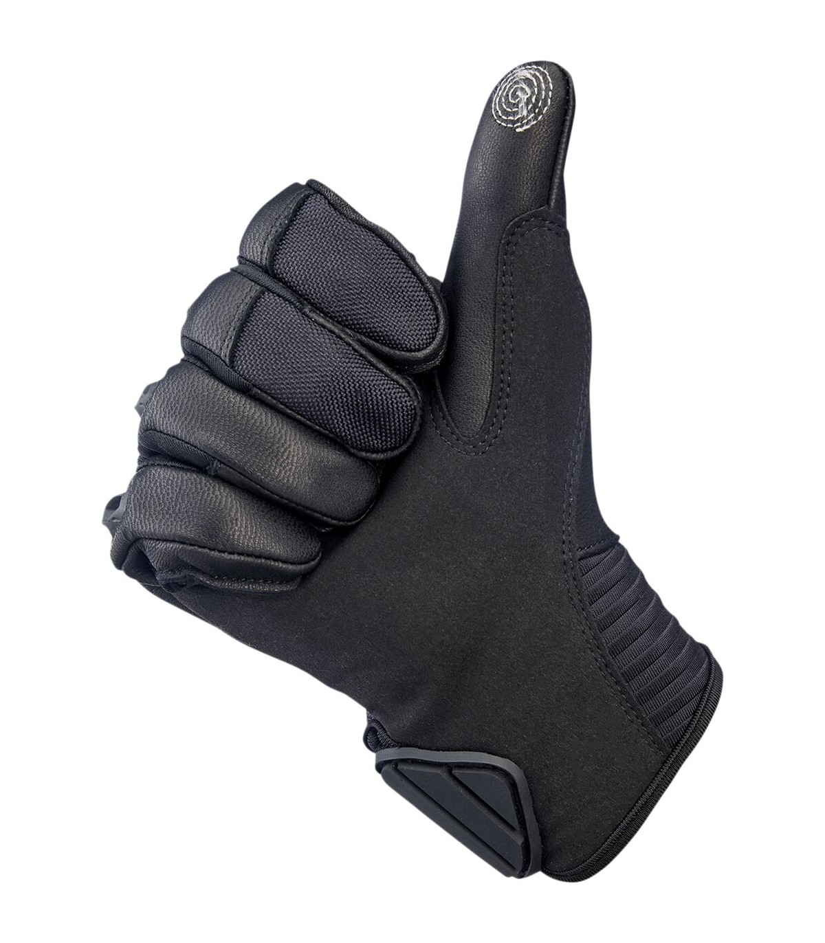 Bridgeport GlovesSupple goatskin leather palm, fingertips, thumb, and friction zonesFlexible thermoplastic rubber wrist tab with molded impact protectionAnatomically shaped synthetic suede palm panel with Lycra flex zoneComfortable two-way stretch laminated neoprene wrist panelBallistic nylon finger, hand, and knuckle guard panelsLycra expansion panels in finger joints for added dexterityPadded high-impact plastic knuckle guard with three-ply vented panelSilicone traction logo on palmMolded plastic finger ventsConductive stitching in fingers and thumb lets you operate smart screens
