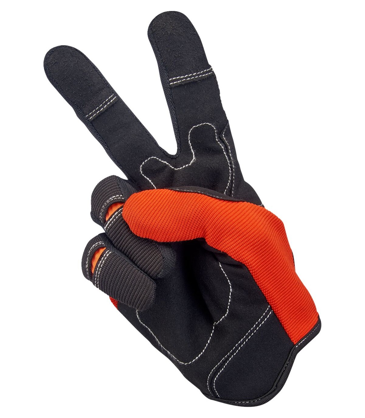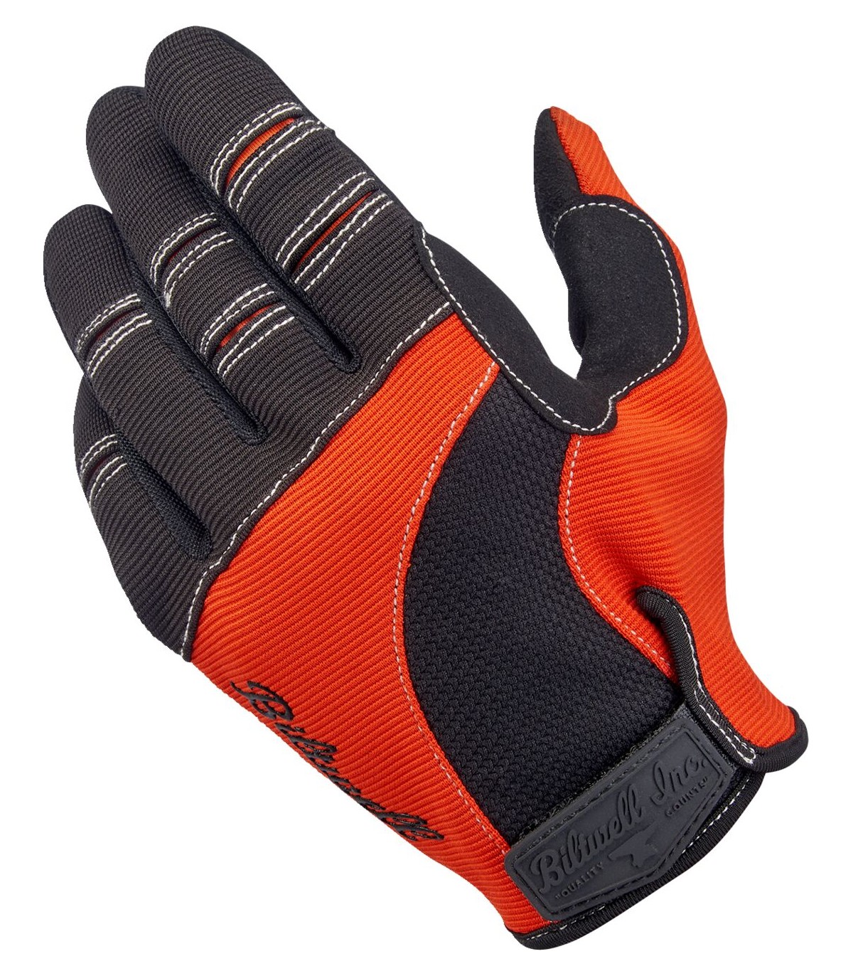 Moto GlovesTwo-way stretch polyester back panels for comfortSingle layer synthetic leather palm with reinforced thumbAdjustable wrist wrap with velcro closure and thermoplastic rubber Biltwell shieldLycra expansion panels in finger joints for enhanced dexterityAccordion baffles on finger joints for added flexibilityRugged single- and double-needle polyester stitching