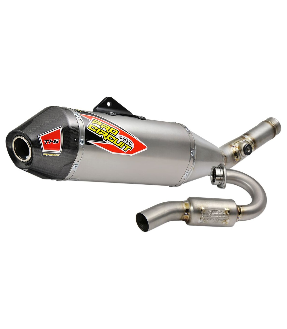 TI-6 Exhaust SystemDesigned to improve performance and power where the Ti-5 showed weak pointsConstructed of titanium throughout the head pipe, mid pipe and canisterThe ideal exhaust for any off-road or closed course racer looking for improved performance, durability and a professional lookComes with a removable United States Forest Service (USFS) Approved Spark Arrestor making it easy to alternate between off-road and closed course ridingIt does NOT pass AMA/FIM sound regulations.