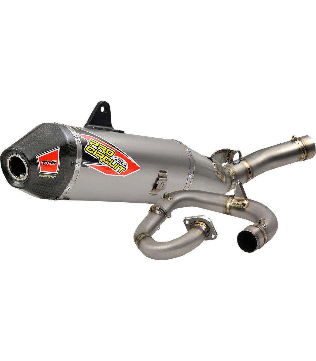 TI-6 Exhaust SystemMachined aluminum muffler brackets for increased strength and durabilityAsymmetrical muffler configuration for increased packing volumeMost systems equipped with a RC-4 Resonance Chamber for reduced sound outputMachined mid pipe to headpipe joint for a better, leak-free fitTIG precision weldingMade in the U.S.A.It does NOT pass AMA/FIM sound regulations.