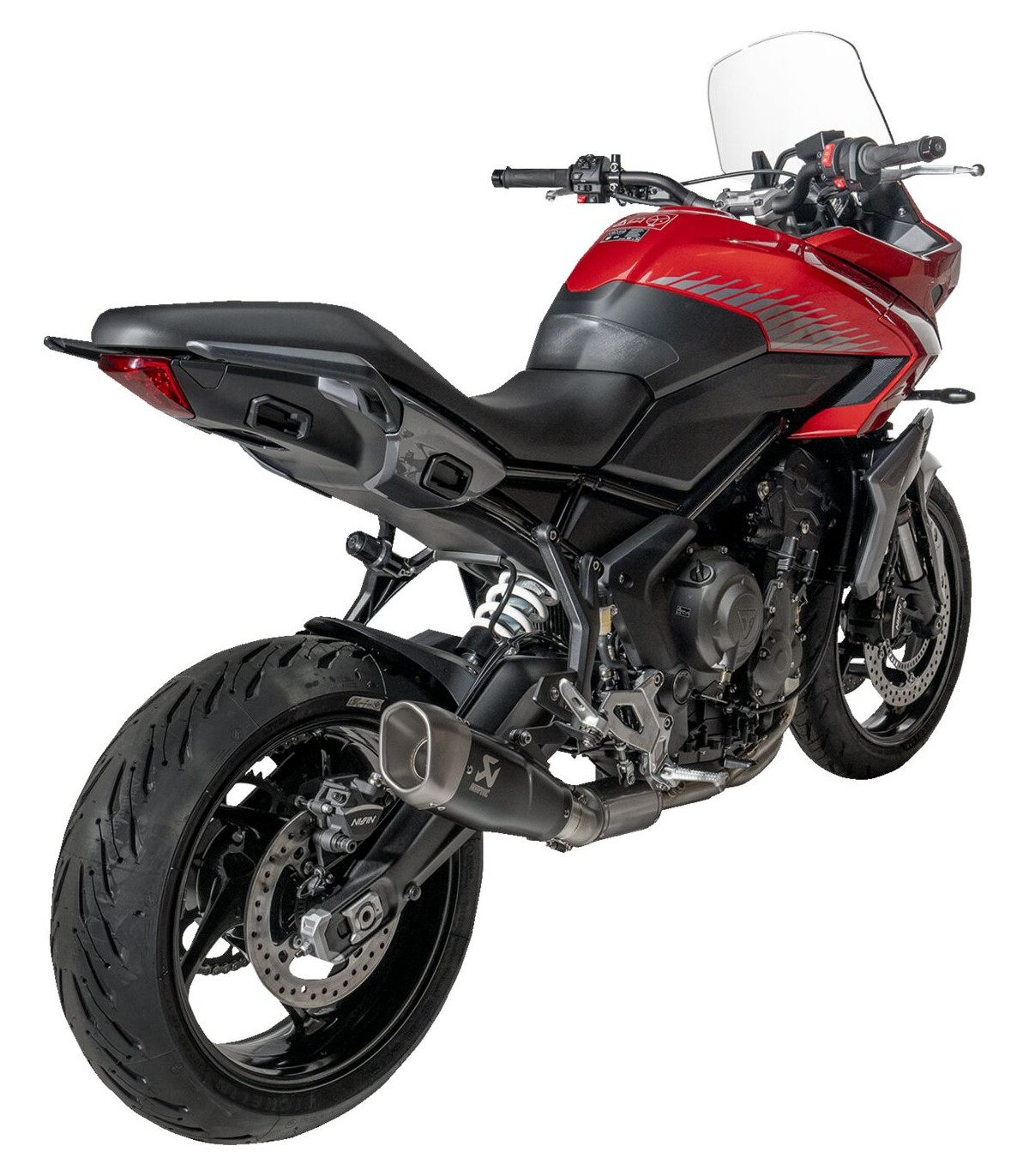 Racing Line Exhaust SystemConsisting of a black-coated, high-grade titanium muffler outer sleeve, with other parts fabricated from stainless steelInnovative technology has created an exceptional design for the bushes and flanges to meet the oval shaped header inlets: the header tubes have been tapered from oval to cylindrical form using hydroforming machineryWith a huge 3.3 kg (41%) weight saving over the stock system and impressive power gains of 2.6 kW (3.5 hp) at 10,000 rpm and torque increase of +2.5 Nm at 10,000 rpm when measured on the Akrapovic dyno against a Trident 660 with a standard stock exhaust system, all combined with a flawless throttle responseA deep, full, and vivid sound is achieved through a specially tuned resonator in the link pipe to create a unique sound experiencePlug-and-play installation with no remapping needed for a system that has been developed to be used on racing tracks and closed coursesInstallation does not fit with the Triumph paddock stand bobbins and does fit with the Triumph belly pan, both of which are original accessories.1861-1779 is required for Tiger Sport 660.