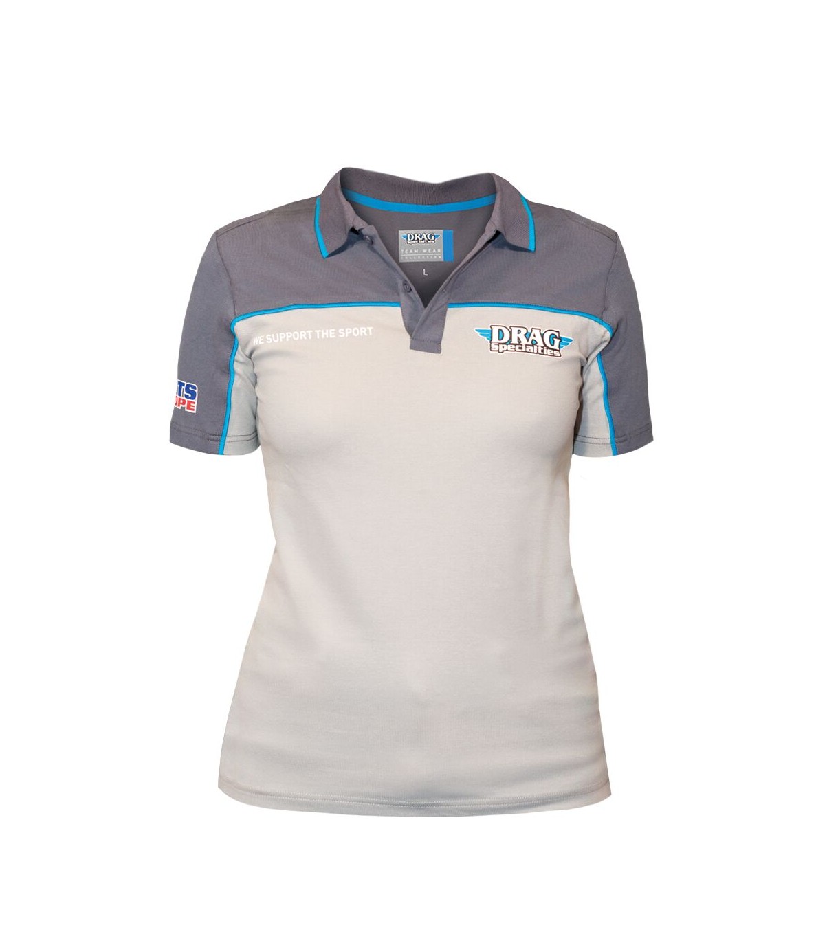 Women's DS ShirtWomen's polo shirt with chest and back Drag Specialties printed logo.Printed logos on sleeves.