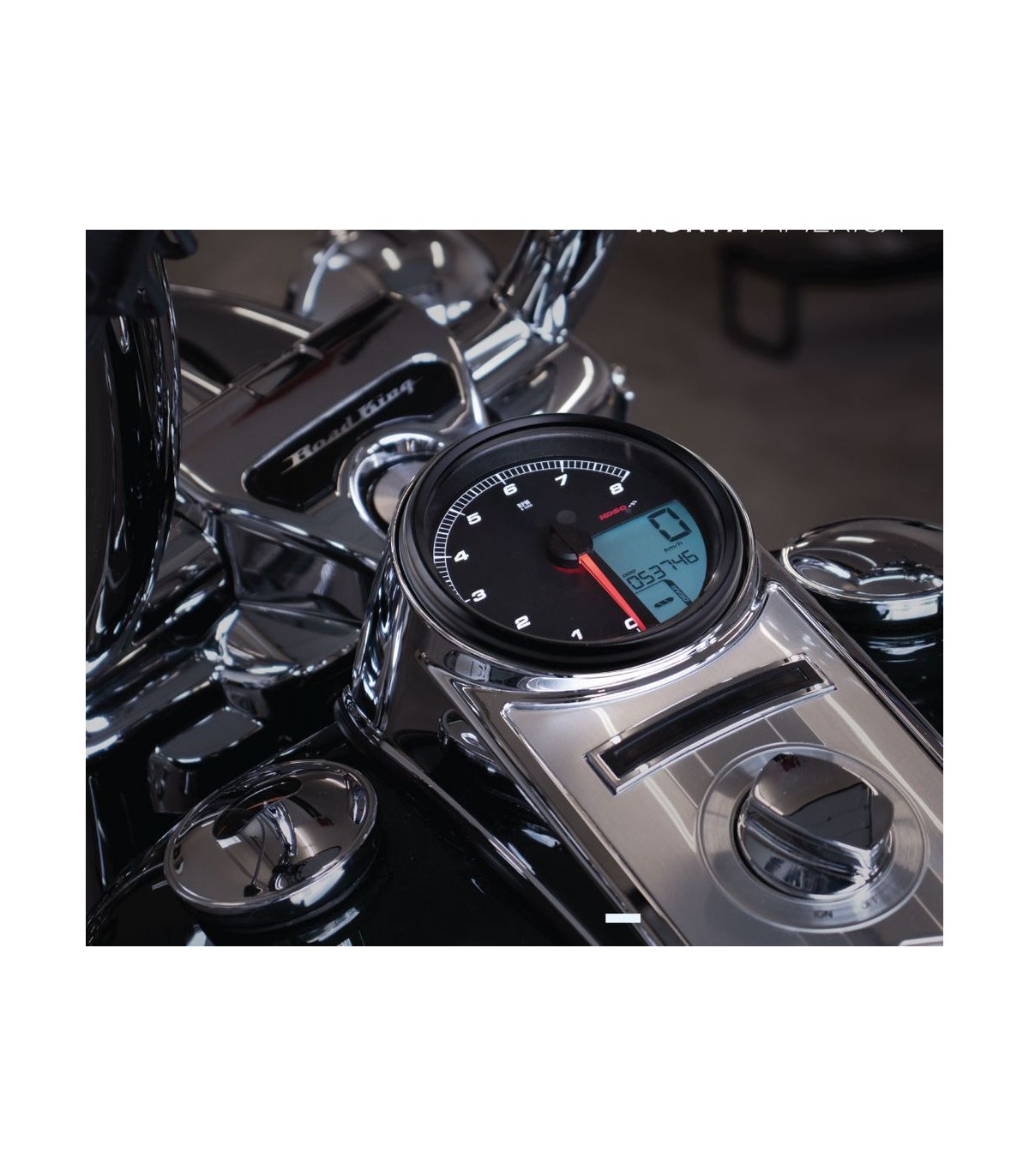 HD-05 Meter for Harley DavidsonThe new PLUG&PLAY HD-05 series for 4 ½” (=11.43cm) Harley-Davidson® models with attached tank contains a speedometer and tachometer in one. In addition, the color of the background lighting is changeable and contains a gear indicator.The meter provides real measurements such as engine temperature, battery voltage, average fuel efficiency and a complete system of indicators to monitor the vital parameters of your motorcycle.This PLUG&PLAY set fits exactly to the existing wiring harness and interacts directly with the CANBUS system of your motorcycle.Speedometer (0 - 225 mph)Tachometer (0 - 8,000 RPM)Odometer (0 - 999,999 miles)Tripmeter (0 - 9,999 miles)Volt meter ( DC 8V - 18V)Fuel Meter (6 levels | 1 level = 16.6%) Fuel Tank Volume (Off/1 - 9.9 US Gallons) - (approx. 37 liters)