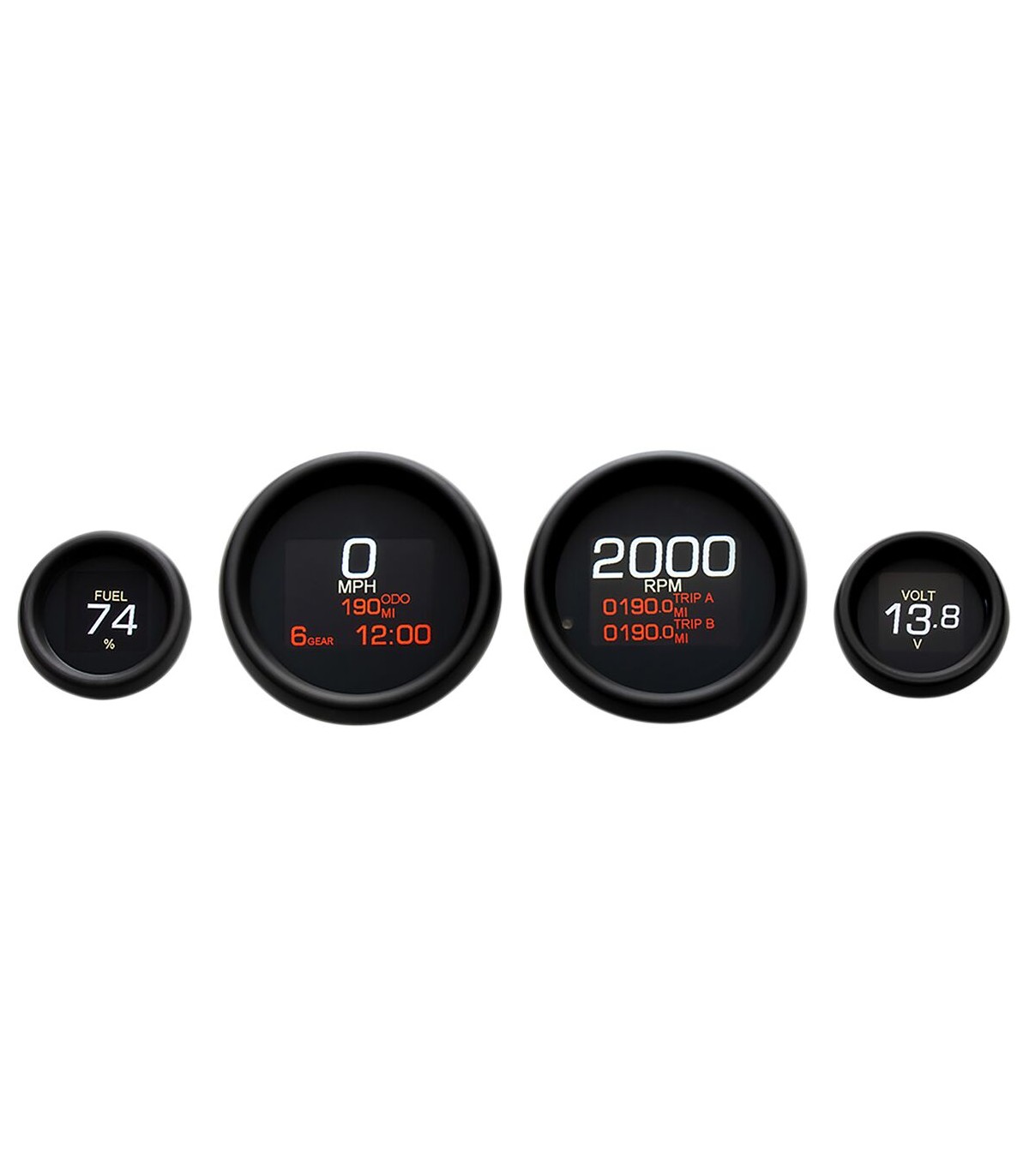 Four-Gauge MLX Series KitFour-gauge kit includes adjustable speedometer with odometer, tachometer, oil temperature (sensor included) and voltage gaugesDisplays clock and gear position; calculate 0-60 time, 1/4-mile time, 1/4-mile speed; feature high-speed and high-rpm recallAlso includes a pair of fully programmable gauges that can display oil pressure, oil temperature (sensor included), voltage and fuel level readingsIncludes a main gauge speedo/tachometer with odometer, dual trip meters and other programmable informationDirect plug-in four-gauge digital instrumentation systemHigh-visibility LED display is easy to read, even in direct sunlightSmall gauges can be programmed for the rider’s ideal layout31 illumination colors availableEU: Displays clock and gear position; calculate 0-100 km/h; feature high-speed and high-rpm recall