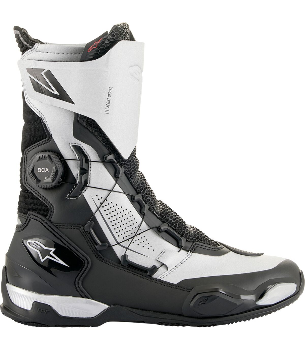 Bottes SP-X BOALes bottes SP-X sont des bottes de sport élégantes qui peuvent se glisser sous un pantalon de moto technique et sont très robustes pour la la marche.Optimisées pour les pilotes sportifs et les adeptes du Sport Touring, ces bottes compactes mi-hautes sont synonymes d’une protection et d’un confort élevés tant sur la moto qu’en dehors.La tige conjugue matériau Rideknit® et maille tricotée et comprend des éléments thermosoudés sans coutures.La partie inférieure de la botte présente un contrefort en TPU, un insert aux orteils et une semelle incorporant la technologie TPF (Transversal Protection Frame) d’Alpinestars ; tous ces éléments fournissent une protection conséquente contre les impacts En outre, la semelle arbore un tout nouveau design avec un talon asymétrique pour faciliter la foulée naturelle du pilote et favoriser la stabilité en dehors de la moto.Les bottes SP-X comportent, en guise de protection, un protège-tibia intégré, des disques double épaisseur aux chevilles, sans oublier un embout pour sélecteur de vitesse en TPU et un renfort aux orteils.Pour le confort, les sections tricotées sur les points de flexion avant et arrière apportent une grande liberté de mouvement, tandis que la semelle intermédiaire en polyuréthane avec double coussin intégré au talon et la semelle intérieure OrthoLite® amovL’enfilage et le retrait sont aisés du fait de la fermeture éclair médiane et du système de laçage rapide BOA, qui créent une fermeture compacte et précise.Les bottes SP-X sont parfaites pour les pilotes sportifs en quête d’une protection adéquate mais qui ne veulent pas de chaussures ressemblant à des bottes de compétition qui se portent par-dessus le pantalon.