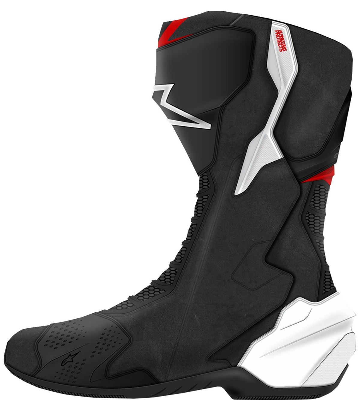 Bottes SMX-6 V3Avec leurs diverses caractéristiques de protection innovantes, les bottes SMX-6 V3 sont un modèle polyvalent, car elles conviennent aussi bien pour s’attaquer aux pistes que pour la conduite sportive. Elles intègrent des technologies et des matériaux issuTige en microfibre élaborée fournissant en toute légèreté une protection contre l’abrasion très efficace et une incroyable flexibilitéLes zones de flexion devant et derrière sont en tissu recouvert de polyuréthane thermoplastique (TPU) souple afin de réduire l’abrasion en cas de choc tout en favorisant une mobilité naturelle vers l’avant et vers l’arrière.Le système d’orthèse de cheville unique d’Alpinestars fournit un support biomécanique et une protection entre le haut du mollet, le tibia et la cheville, pour une articulation de la cheville optimale et, en même temps, limite la torsion excessive, l’hyperLe système Lace-Lock d’Alpinestars est constitué d’une résine polymère sophistiquée, qui assure une fermeture rapide, précise et sûre.Équipées d’une section de contact avec le sélecteur de vitesse en TPU pour une protection élevée sur le côté médian inférieurUn protège-tibia dérivé de la course en TPU, stratégiquement placé, délivre une résistance remarquable aux chocs et à l’abrasion.Des protections de chevilles à double densité en TPU sont positionnées de manière stratégique entre la tige et la doublure rembourrée en vue de préserver les zones clés.Un insert d’orteils en TPU double densité remplaçable à visser offre une couverture extérieure intégrale autour de la zone des orteils et engendre une marche confortable du fait de son extrême souplesse.L’insert remplaçable et l’insert latéral externe au talon sont stratégiquement positionnés de façon à ce que les chocs soient atténués et amortis au mieux et aident à provoquer le glissement en cas d’accident.