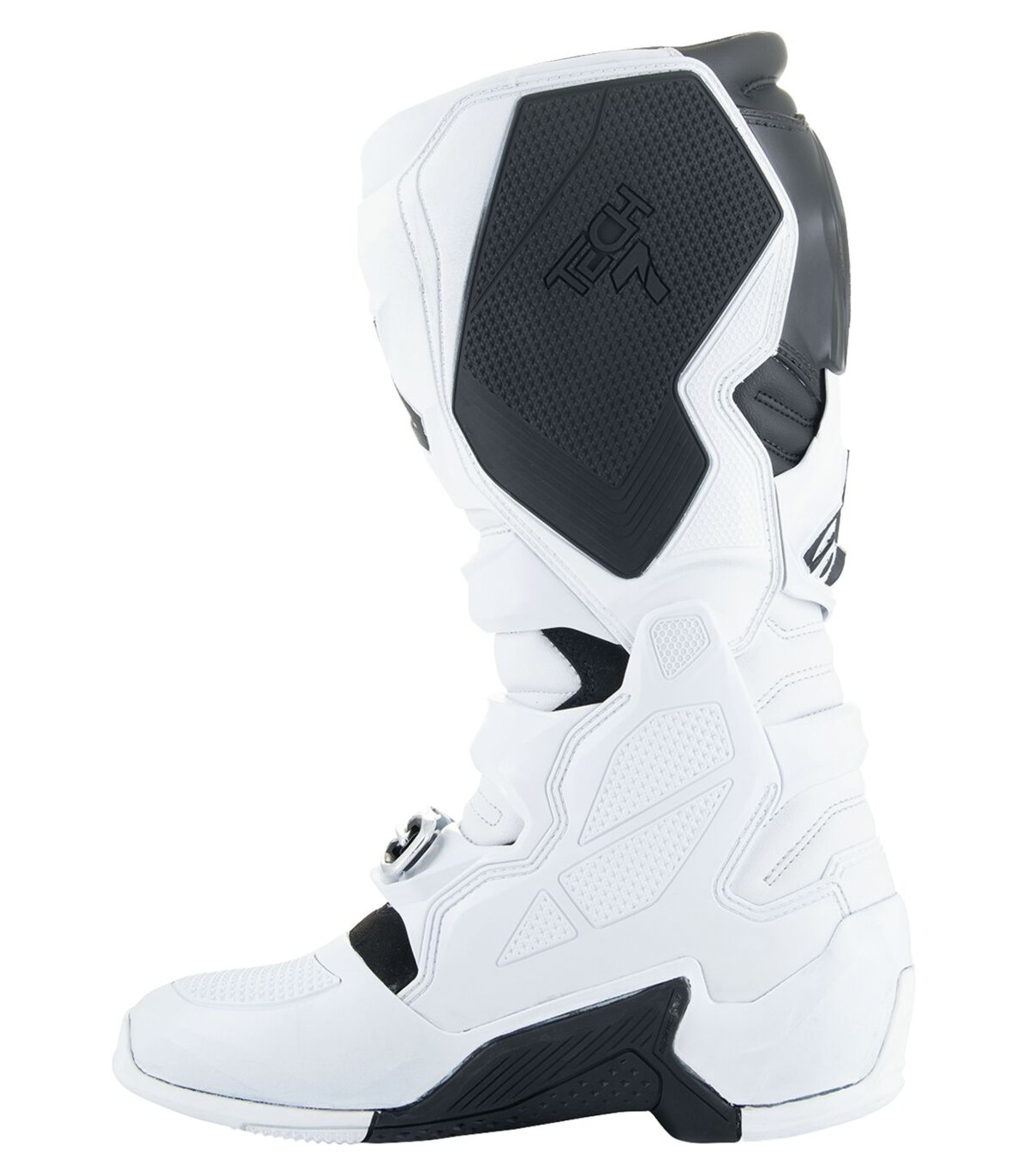 Bottes Tech 7Les bottes Tech 7 ont été complètement réinventées de manière à fournir des performances exceptionnelles en tout-terrain.Mises au point pour être extrêmement légères, confortables et protectrices en vue d’offrir des sensations exceptionnelles sur la motoLa coque inférieure en polyuréthane thermoplastique (TPU) arbore un design innovant à hauteur du sélecteur de vitesse, qui vise à atténuer le basculement vers l’avant et à faciliter le contrôle du sélecteur et qui diverge d’un pied à l’autre.Consolidation à l’aide d’une tige en métal et renfort aux orteils générant une résistance aux chocs et à l’abrasionAvec système de double pivot latéral et médian pour une flexibilité et une précision optimiséesConception spéciale sur la paroi latérale médiane, destinée à améliorer la sensation, le soutien et l’adhérence sur la moto tout en augmentant la protection et la robustesse de la chaussureLa plaque de protection du mollet en TPU profilée confère une résistance aux chocs efficace.La flexion principale de la botte est soutenue autour de la partie médiane et du côté de la cheville par un système de pivot low-profile, accentuant la liberté de mouvement et l’aisance du pilote.Sur la zone de flexion avant, le soufflet avant comporte des inserts d’amortissement innovants, pour un soutien progressif.Des rembourrages sont également placés stratégiquement sur les chevilles et les protège-tibias en vue de mieux amortir les chocs.Les fixations de sangles sont modulables et pivotent largement, se bloquant néanmoins lorsque la rotation est trop importante.Une couche d’indication de l’usure novatrice est incorporée dans la semelle, dans la zone en contact avec le repose-pied ; elle devient rouge lorsque la semelle est usée et doit être remplacée.Sous l’indicateur d’usure, la botte est enveloppée d’une couche de Kevlar® qui maintient sa structure et son intégrité tout en la protégeant.Le système de fermeture se compose de boucles en polymère et d’un cadre en aluminium avec des attaches rapides auto-alignantes qui créent un ajustement personnalisé et fiable.Le logement pour la boucle est conçu pour s’aligner automatiquement, assurant un serrage sûr tout en empêchant la rotation de la sangle.Le pourtour en microfibre souple est tout spécialement adapté à l’arrière de la botte et évite que trop d’eau ou de saletés ne pénètrent.Le grand panneau médian est en TPU et intègre désormais un insert en caoutchouc élargi délivrant une surface d’accroche sur la moto plus étendue et une résistance à la chaleur et à l’abrasion supérieure.La languette d’ouverture est conçue pour simplifier l’enfilage et le retrait.Protège-tibia en TPU compact repensé afin d’être davantage polyvalent, avec scratch de fermeture renforcé pour un ajustement confortable et totalement sur mesureDu TPU protecteur est utilisé en quantité sur la tige, au niveau des orteils, du pied, du talon, de la cheville, du mollet et du tibia, et des composés extrêmement résistants recouvrent la pointe des pieds et le talon pour intensifier la résistance aux chTige en daim avec structure en microfibre légère qui contribue à une résistance élevée aux chocs et à l’abrasionPont arrière supplémentaire en TPU pour protéger le tendon d’AchilleAvec doublure en polyester constituée de mousse à cellules ouvertes 3D et d’un renfort en daim antidérapant au talon pour une meilleure résistance à l’abrasionLa semelle monobloc est faite de caoutchouc vulcanisé à double composition ultra durable, pour plus de robustesse et de protection.La semelle peut être remplacée