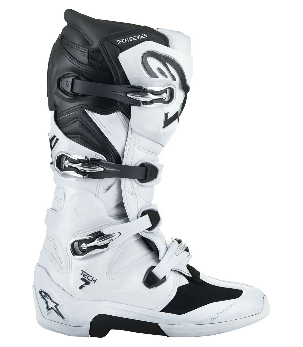 Bottes Tech 7Les bottes Tech 7 ont été complètement réinventées de manière à fournir des performances exceptionnelles en tout-terrain.Mises au point pour être extrêmement légères, confortables et protectrices en vue d’offrir des sensations exceptionnelles sur la motoLa coque inférieure en polyuréthane thermoplastique (TPU) arbore un design innovant à hauteur du sélecteur de vitesse, qui vise à atténuer le basculement vers l’avant et à faciliter le contrôle du sélecteur et qui diverge d’un pied à l’autre.Consolidation à l’aide d’une tige en métal et renfort aux orteils générant une résistance aux chocs et à l’abrasionAvec système de double pivot latéral et médian pour une flexibilité et une précision optimiséesConception spéciale sur la paroi latérale médiane, destinée à améliorer la sensation, le soutien et l’adhérence sur la moto tout en augmentant la protection et la robustesse de la chaussureLa plaque de protection du mollet en TPU profilée confère une résistance aux chocs efficace.La flexion principale de la botte est soutenue autour de la partie médiane et du côté de la cheville par un système de pivot low-profile, accentuant la liberté de mouvement et l’aisance du pilote.Sur la zone de flexion avant, le soufflet avant comporte des inserts d’amortissement innovants, pour un soutien progressif.Des rembourrages sont également placés stratégiquement sur les chevilles et les protège-tibias en vue de mieux amortir les chocs.Les fixations de sangles sont modulables et pivotent largement, se bloquant néanmoins lorsque la rotation est trop importante.Une couche d’indication de l’usure novatrice est incorporée dans la semelle, dans la zone en contact avec le repose-pied ; elle devient rouge lorsque la semelle est usée et doit être remplacée.Sous l’indicateur d’usure, la botte est enveloppée d’une couche de Kevlar® qui maintient sa structure et son intégrité tout en la protégeant.Le système de fermeture se compose de boucles en polymère et d’un cadre en aluminium avec des attaches rapides auto-alignantes qui créent un ajustement personnalisé et fiable.Le logement pour la boucle est conçu pour s’aligner automatiquement, assurant un serrage sûr tout en empêchant la rotation de la sangle.Le pourtour en microfibre souple est tout spécialement adapté à l’arrière de la botte et évite que trop d’eau ou de saletés ne pénètrent.Le grand panneau médian est en TPU et intègre désormais un insert en caoutchouc élargi délivrant une surface d’accroche sur la moto plus étendue et une résistance à la chaleur et à l’abrasion supérieure.La languette d’ouverture est conçue pour simplifier l’enfilage et le retrait.Protège-tibia en TPU compact repensé afin d’être davantage polyvalent, avec scratch de fermeture renforcé pour un ajustement confortable et totalement sur mesureDu TPU protecteur est utilisé en quantité sur la tige, au niveau des orteils, du pied, du talon, de la cheville, du mollet et du tibia, et des composés extrêmement résistants recouvrent la pointe des pieds et le talon pour intensifier la résistance aux chTige en daim avec structure en microfibre légère qui contribue à une résistance élevée aux chocs et à l’abrasionPont arrière supplémentaire en TPU pour protéger le tendon d’AchilleAvec doublure en polyester constituée de mousse à cellules ouvertes 3D et d’un renfort en daim antidérapant au talon pour une meilleure résistance à l’abrasionLa semelle monobloc est faite de caoutchouc vulcanisé à double composition ultra durable, pour plus de robustesse et de protection.La semelle peut être remplacée