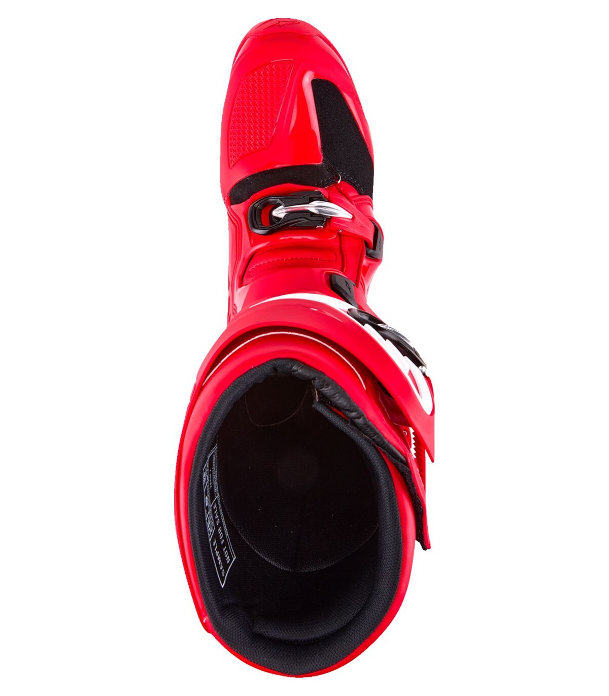 Bottes Tech 7Les bottes Tech 7 ont été complètement réinventées de manière à fournir des performances exceptionnelles en tout-terrain.Mises au point pour être extrêmement légères, confortables et protectrices en vue d’offrir des sensations exceptionnelles sur la motoLa coque inférieure en polyuréthane thermoplastique (TPU) arbore un design innovant à hauteur du sélecteur de vitesse, qui vise à atténuer le basculement vers l’avant et à faciliter le contrôle du sélecteur et qui diverge d’un pied à l’autre.Consolidation à l’aide d’une tige en métal et renfort aux orteils générant une résistance aux chocs et à l’abrasionAvec système de double pivot latéral et médian pour une flexibilité et une précision optimiséesConception spéciale sur la paroi latérale médiane, destinée à améliorer la sensation, le soutien et l’adhérence sur la moto tout en augmentant la protection et la robustesse de la chaussureLa plaque de protection du mollet en TPU profilée confère une résistance aux chocs efficace.La flexion principale de la botte est soutenue autour de la partie médiane et du côté de la cheville par un système de pivot low-profile, accentuant la liberté de mouvement et l’aisance du pilote.Sur la zone de flexion avant, le soufflet avant comporte des inserts d’amortissement innovants, pour un soutien progressif.Des rembourrages sont également placés stratégiquement sur les chevilles et les protège-tibias en vue de mieux amortir les chocs.Les fixations de sangles sont modulables et pivotent largement, se bloquant néanmoins lorsque la rotation est trop importante.Une couche d’indication de l’usure novatrice est incorporée dans la semelle, dans la zone en contact avec le repose-pied ; elle devient rouge lorsque la semelle est usée et doit être remplacée.Sous l’indicateur d’usure, la botte est enveloppée d’une couche de Kevlar® qui maintient sa structure et son intégrité tout en la protégeant.Le système de fermeture se compose de boucles en polymère et d’un cadre en aluminium avec des attaches rapides auto-alignantes qui créent un ajustement personnalisé et fiable.Le logement pour la boucle est conçu pour s’aligner automatiquement, assurant un serrage sûr tout en empêchant la rotation de la sangle.Le pourtour en microfibre souple est tout spécialement adapté à l’arrière de la botte et évite que trop d’eau ou de saletés ne pénètrent.Le grand panneau médian est en TPU et intègre désormais un insert en caoutchouc élargi délivrant une surface d’accroche sur la moto plus étendue et une résistance à la chaleur et à l’abrasion supérieure.La languette d’ouverture est conçue pour simplifier l’enfilage et le retrait.Protège-tibia en TPU compact repensé afin d’être davantage polyvalent, avec scratch de fermeture renforcé pour un ajustement confortable et totalement sur mesureDu TPU protecteur est utilisé en quantité sur la tige, au niveau des orteils, du pied, du talon, de la cheville, du mollet et du tibia, et des composés extrêmement résistants recouvrent la pointe des pieds et le talon pour intensifier la résistance aux chTige en daim avec structure en microfibre légère qui contribue à une résistance élevée aux chocs et à l’abrasionPont arrière supplémentaire en TPU pour protéger le tendon d’AchilleAvec doublure en polyester constituée de mousse à cellules ouvertes 3D et d’un renfort en daim antidérapant au talon pour une meilleure résistance à l’abrasionLa semelle monobloc est faite de caoutchouc vulcanisé à double composition ultra durable, pour plus de robustesse et de protection.La semelle peut être remplacée
