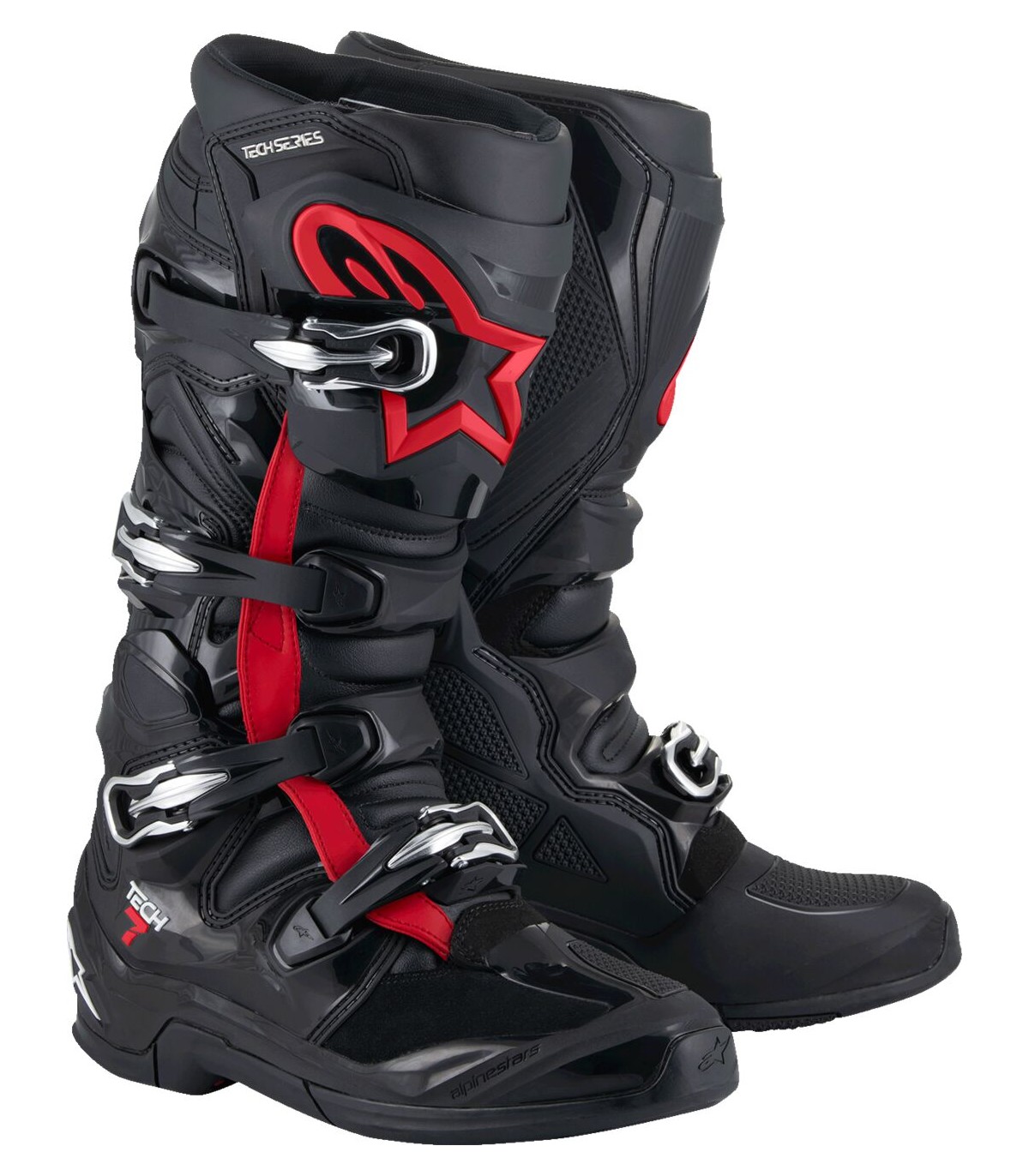 Bottes Tech 7Les bottes Tech 7 ont été complètement réinventées de manière à fournir des performances exceptionnelles en tout-terrain.Mises au point pour être extrêmement légères, confortables et protectrices en vue d’offrir des sensations exceptionnelles sur la motoLa coque inférieure en polyuréthane thermoplastique (TPU) arbore un design innovant à hauteur du sélecteur de vitesse, qui vise à atténuer le basculement vers l’avant et à faciliter le contrôle du sélecteur et qui diverge d’un pied à l’autre.Consolidation à l’aide d’une tige en métal et renfort aux orteils générant une résistance aux chocs et à l’abrasionAvec système de double pivot latéral et médian pour une flexibilité et une précision optimiséesConception spéciale sur la paroi latérale médiane, destinée à améliorer la sensation, le soutien et l’adhérence sur la moto tout en augmentant la protection et la robustesse de la chaussureLa plaque de protection du mollet en TPU profilée confère une résistance aux chocs efficace.La flexion principale de la botte est soutenue autour de la partie médiane et du côté de la cheville par un système de pivot low-profile, accentuant la liberté de mouvement et l’aisance du pilote.Sur la zone de flexion avant, le soufflet avant comporte des inserts d’amortissement innovants, pour un soutien progressif.Des rembourrages sont également placés stratégiquement sur les chevilles et les protège-tibias en vue de mieux amortir les chocs.Les fixations de sangles sont modulables et pivotent largement, se bloquant néanmoins lorsque la rotation est trop importante.Une couche d’indication de l’usure novatrice est incorporée dans la semelle, dans la zone en contact avec le repose-pied ; elle devient rouge lorsque la semelle est usée et doit être remplacée.Sous l’indicateur d’usure, la botte est enveloppée d’une couche de Kevlar® qui maintient sa structure et son intégrité tout en la protégeant.Le système de fermeture se compose de boucles en polymère et d’un cadre en aluminium avec des attaches rapides auto-alignantes qui créent un ajustement personnalisé et fiable.Le logement pour la boucle est conçu pour s’aligner automatiquement, assurant un serrage sûr tout en empêchant la rotation de la sangle.Le pourtour en microfibre souple est tout spécialement adapté à l’arrière de la botte et évite que trop d’eau ou de saletés ne pénètrent.Le grand panneau médian est en TPU et intègre désormais un insert en caoutchouc élargi délivrant une surface d’accroche sur la moto plus étendue et une résistance à la chaleur et à l’abrasion supérieure.La languette d’ouverture est conçue pour simplifier l’enfilage et le retrait.Protège-tibia en TPU compact repensé afin d’être davantage polyvalent, avec scratch de fermeture renforcé pour un ajustement confortable et totalement sur mesureDu TPU protecteur est utilisé en quantité sur la tige, au niveau des orteils, du pied, du talon, de la cheville, du mollet et du tibia, et des composés extrêmement résistants recouvrent la pointe des pieds et le talon pour intensifier la résistance aux chTige en daim avec structure en microfibre légère qui contribue à une résistance élevée aux chocs et à l’abrasionPont arrière supplémentaire en TPU pour protéger le tendon d’AchilleAvec doublure en polyester constituée de mousse à cellules ouvertes 3D et d’un renfort en daim antidérapant au talon pour une meilleure résistance à l’abrasionLa semelle monobloc est faite de caoutchouc vulcanisé à double composition ultra durable, pour plus de robustesse et de protection.La semelle peut être remplacée