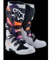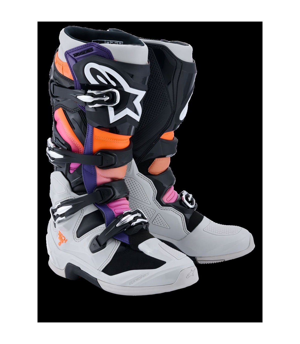 Bottes Tech 7Les bottes Tech 7 ont été complètement réinventées de manière à fournir des performances exceptionnelles en tout-terrain.Mises au point pour être extrêmement légères, confortables et protectrices en vue d’offrir des sensations exceptionnelles sur la motoLa coque inférieure en polyuréthane thermoplastique (TPU) arbore un design innovant à hauteur du sélecteur de vitesse, qui vise à atténuer le basculement vers l’avant et à faciliter le contrôle du sélecteur et qui diverge d’un pied à l’autre.Consolidation à l’aide d’une tige en métal et renfort aux orteils générant une résistance aux chocs et à l’abrasionAvec système de double pivot latéral et médian pour une flexibilité et une précision optimiséesConception spéciale sur la paroi latérale médiane, destinée à améliorer la sensation, le soutien et l’adhérence sur la moto tout en augmentant la protection et la robustesse de la chaussureLa plaque de protection du mollet en TPU profilée confère une résistance aux chocs efficace.La flexion principale de la botte est soutenue autour de la partie médiane et du côté de la cheville par un système de pivot low-profile, accentuant la liberté de mouvement et l’aisance du pilote.Sur la zone de flexion avant, le soufflet avant comporte des inserts d’amortissement innovants, pour un soutien progressif.Des rembourrages sont également placés stratégiquement sur les chevilles et les protège-tibias en vue de mieux amortir les chocs.Les fixations de sangles sont modulables et pivotent largement, se bloquant néanmoins lorsque la rotation est trop importante.Une couche d’indication de l’usure novatrice est incorporée dans la semelle, dans la zone en contact avec le repose-pied ; elle devient rouge lorsque la semelle est usée et doit être remplacée.Sous l’indicateur d’usure, la botte est enveloppée d’une couche de Kevlar® qui maintient sa structure et son intégrité tout en la protégeant.Le système de fermeture se compose de boucles en polymère et d’un cadre en aluminium avec des attaches rapides auto-alignantes qui créent un ajustement personnalisé et fiable.Le logement pour la boucle est conçu pour s’aligner automatiquement, assurant un serrage sûr tout en empêchant la rotation de la sangle.Le pourtour en microfibre souple est tout spécialement adapté à l’arrière de la botte et évite que trop d’eau ou de saletés ne pénètrent.Le grand panneau médian est en TPU et intègre désormais un insert en caoutchouc élargi délivrant une surface d’accroche sur la moto plus étendue et une résistance à la chaleur et à l’abrasion supérieure.La languette d’ouverture est conçue pour simplifier l’enfilage et le retrait.Protège-tibia en TPU compact repensé afin d’être davantage polyvalent, avec scratch de fermeture renforcé pour un ajustement confortable et totalement sur mesureDu TPU protecteur est utilisé en quantité sur la tige, au niveau des orteils, du pied, du talon, de la cheville, du mollet et du tibia, et des composés extrêmement résistants recouvrent la pointe des pieds et le talon pour intensifier la résistance aux chTige en daim avec structure en microfibre légère qui contribue à une résistance élevée aux chocs et à l’abrasionPont arrière supplémentaire en TPU pour protéger le tendon d’AchilleAvec doublure en polyester constituée de mousse à cellules ouvertes 3D et d’un renfort en daim antidérapant au talon pour une meilleure résistance à l’abrasionLa semelle monobloc est faite de caoutchouc vulcanisé à double composition ultra durable, pour plus de robustesse et de protection.La semelle peut être remplacée