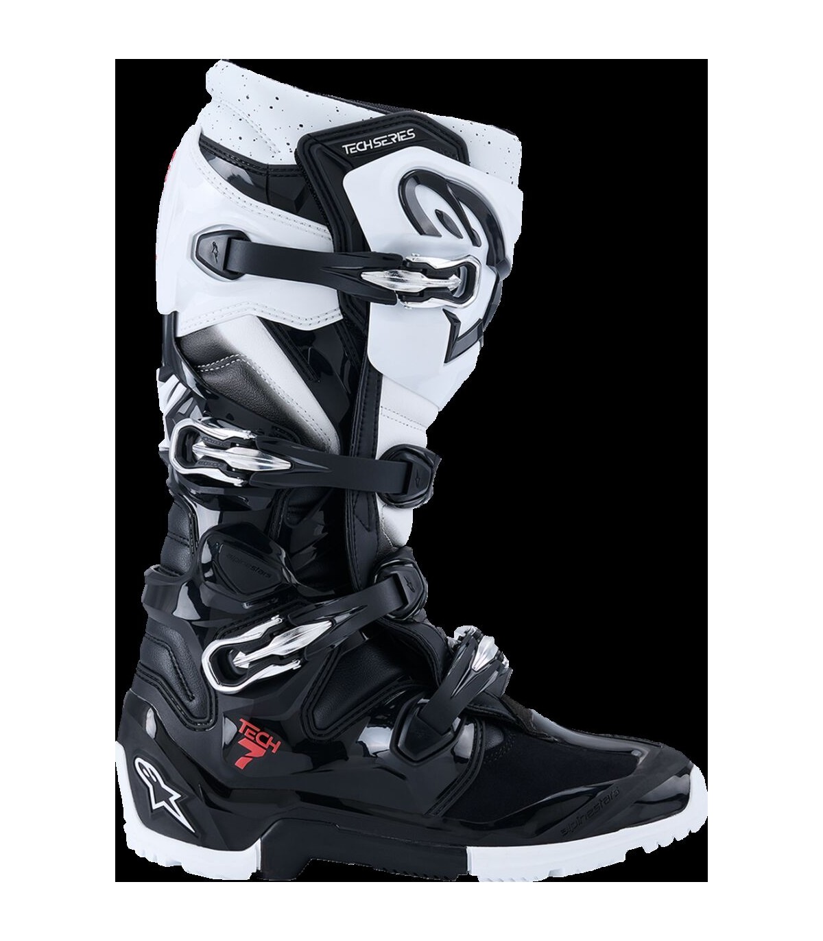 Bottes enduro Tech 7Partie supérieure fabriquée d’une microfibre innovatrice et légère, flexible et résistante à l'abrasionFabrication innovante et révolutionnaire du protège-tibia en polyuréthane thermoplastique (TPU) pour s’adapter à une grande quantité de taillesLe protège-tibia est muni d’un scratch de fermeture renforcé pour un ajustement personnalisé et plus confortableLa zone du tibia comporte un système Blade en TPU conçu afin d’éviter l’hyper-extension frontale et offrir ainsi un plus grand contrôle de la flexibilitéLa semelle spécialement conçue offre aux pilotes Enduro une accroche, durabilité et sensation supérieure avec un degré de rigidité structurelle élevéUne large ouverture d’enfilage pour plus de commodité avec un scratch de fermeture supérieure avec un rabat en TPU permet de s’adapter et de supporter une grande quantité de tailles de molletsLa zone médiane est fabriquée avec un seul panneau en TPU avec une structure alvéolaire afin d’obtenir un maximum d’accroche avec la moto et pour une meilleure résistance à l'abrasion et à la chaleurLa zone de flexion arrière de la botte est supportée autour du mollet par un système Blade coulissant en TPU qui dissipe la frictionLe système à boucle ergonomique offre un ajustement fiable et hautement personnaliséLa protection latérale de la cheville en TPU offre un maillon biomécanique entre la zone médiane et latérale inférieure de la botteLes zones de flexibilité en accordéon du coup-de-pied et du talon d’Achille sont conçues afin d’offrir un contrôle et un support supérieurLa coque inférieure en TPU est renforcée avec un corps en métal qui comporte des renforts aux doigts pour plus de résistance aux chocs et à l’abrasionLe pourtour étendu en microfibre limite l’entrée excessive d’eau et de saletésLe système de fermeture comprend des boucles en polymère et un châssis en aluminium avec des fermetures à détachage rapide auto-alignantes pour un ajustement personnalisé et fiableToutes les boucles peuvent être remplacéesRevêtement interne 3D avec maille respirante doté de renfort en daim microfibre pour la zone de la chevilleUne mousse souple enveloppe les chevilles et le col, offrant plus de confort et une meilleure performance d’absorption des chocsSemelle anatomique amovibleSemelle extérieure exclusive en composé de caoutchouc à double densité antidérapantLa semelle peut être remplacée