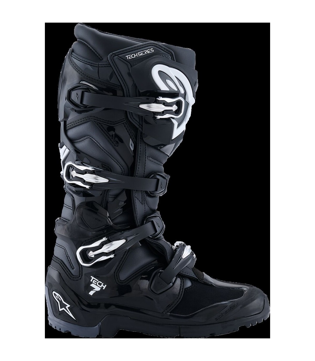 Bottes enduro Tech 7Partie supérieure fabriquée d’une microfibre innovatrice et légère, flexible et résistante à l'abrasionFabrication innovante et révolutionnaire du protège-tibia en polyuréthane thermoplastique (TPU) pour s’adapter à une grande quantité de taillesLe protège-tibia est muni d’un scratch de fermeture renforcé pour un ajustement personnalisé et plus confortableLa zone du tibia comporte un système Blade en TPU conçu afin d’éviter l’hyper-extension frontale et offrir ainsi un plus grand contrôle de la flexibilitéLa semelle spécialement conçue offre aux pilotes Enduro une accroche, durabilité et sensation supérieure avec un degré de rigidité structurelle élevéUne large ouverture d’enfilage pour plus de commodité avec un scratch de fermeture supérieure avec un rabat en TPU permet de s’adapter et de supporter une grande quantité de tailles de molletsLa zone médiane est fabriquée avec un seul panneau en TPU avec une structure alvéolaire afin d’obtenir un maximum d’accroche avec la moto et pour une meilleure résistance à l'abrasion et à la chaleurLa zone de flexion arrière de la botte est supportée autour du mollet par un système Blade coulissant en TPU qui dissipe la frictionLe système à boucle ergonomique offre un ajustement fiable et hautement personnaliséLa protection latérale de la cheville en TPU offre un maillon biomécanique entre la zone médiane et latérale inférieure de la botteLes zones de flexibilité en accordéon du coup-de-pied et du talon d’Achille sont conçues afin d’offrir un contrôle et un support supérieurLa coque inférieure en TPU est renforcée avec un corps en métal qui comporte des renforts aux doigts pour plus de résistance aux chocs et à l’abrasionLe pourtour étendu en microfibre limite l’entrée excessive d’eau et de saletésLe système de fermeture comprend des boucles en polymère et un châssis en aluminium avec des fermetures à détachage rapide auto-alignantes pour un ajustement personnalisé et fiableToutes les boucles peuvent être remplacéesRevêtement interne 3D avec maille respirante doté de renfort en daim microfibre pour la zone de la chevilleUne mousse souple enveloppe les chevilles et le col, offrant plus de confort et une meilleure performance d’absorption des chocsSemelle anatomique amovibleSemelle extérieure exclusive en composé de caoutchouc à double densité antidérapantLa semelle peut être remplacée