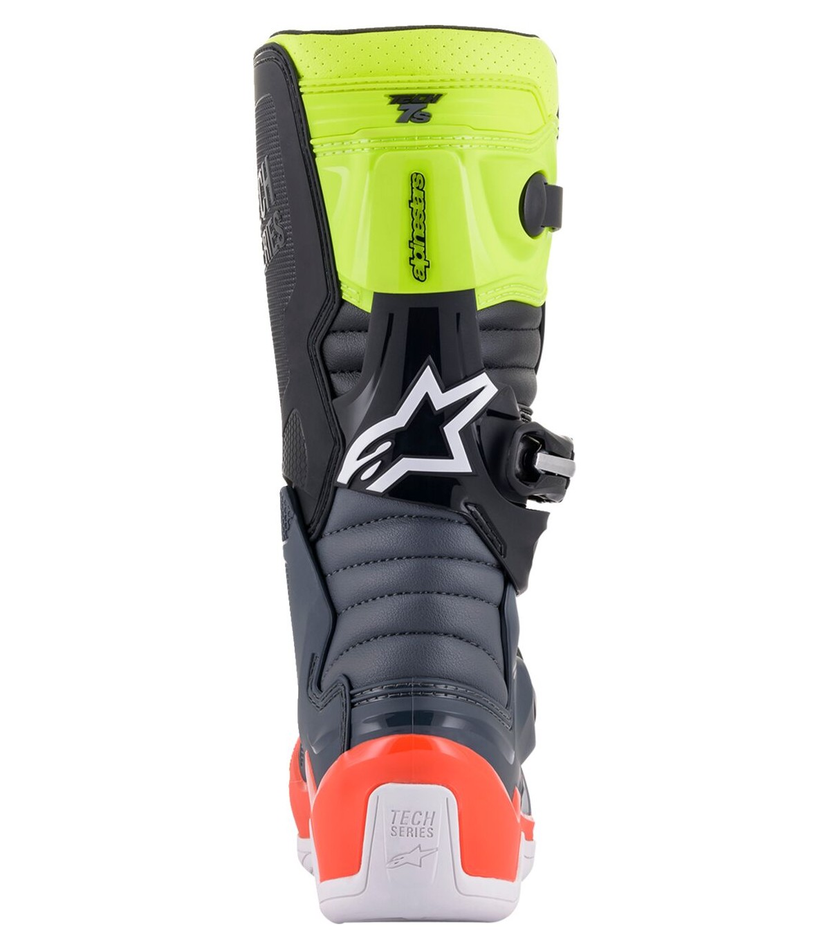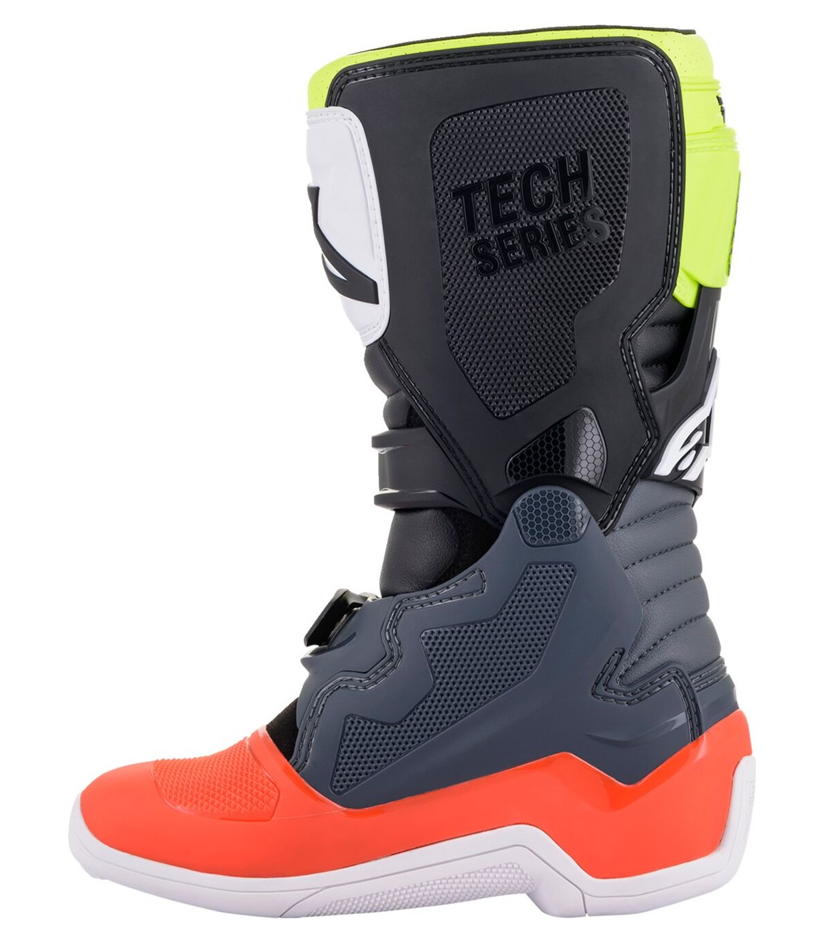 Bottes enfant Tech 7STailles spécialement conçues pour enfants et/ou pilotes de petite taillePartie supérieure en microfibre renforcée avec du polyuréthane (PU) pour plus de flexibilité et de résistance à l’abrasion, à l'eau avec une réduction du poidsLe matériel garantit un bon ajustement, est facile à entretenir et à nettoyerLe protège-tibia profilé est injecté de polyuréthane thermoplastique (TPU) de masse molaire très élevée afin d’obtenir une excellente résistance aux chocs et à l’abrasion.Sur le côté médian figure un panneau en TPU spécialement sculpté afin d’obtenir une accroche optimale avec la moto et une meilleure résistance à la chaleur et à l’abrasion.Coque du pied à double composant injecté en une seule pièce avec protection pour les orteils rigide co-injectée et tige en acier intégréeLa coque est extrêmement résistante à l'abrasion et aux chocs et donne à la botte plus de durabilité tout en améliorant le profilage de la boteFlexion excellente grâce au système de pivot médian et latéral low-profile qui offre mouvement et supportLes zones de flexibilité en accordéon du coup-de-pied et du talon d’Achille sont conçues afin d’offrir un contrôle et un support supérieurLe pourtour étendu en microfibre limite l’entrée excessive d’eau et de saletésLa semelle en composé est totalement intégrée dans la structure de la base offrant plus de durabilité, de sensation et un patron d’accroche en caoutchouc à performance élevéeLa semelle peut être remplacéeRenfort en mousse poly souple aux chevilles et au col pour plus de confort et absorption des chocsSemelle intérieure anatomique et amovible offrant plus de confort et de support qui garantit une distribution homogène du poidsMaille textile 3D avec mousse à cellules ouvertes afin d’obtenir plus de confort et une meilleure circulation de l'airLe système de fermeture à boucle intègre des bras de boucle en polymère et en fibre de verre et des fermetures de support en aluminium résistantes aux chocs pour plus de durabilité et une réduction du poidsLe système à boucle est doté d’un réglage de longueur de boucle à mémoire avec un système d'attache/détachage rapide et auto-alignant pour une fermeture plus facile et précise offrant une meilleure performance et sécurité pendant la conduiteToutes les boucles peuvent être remplacées
