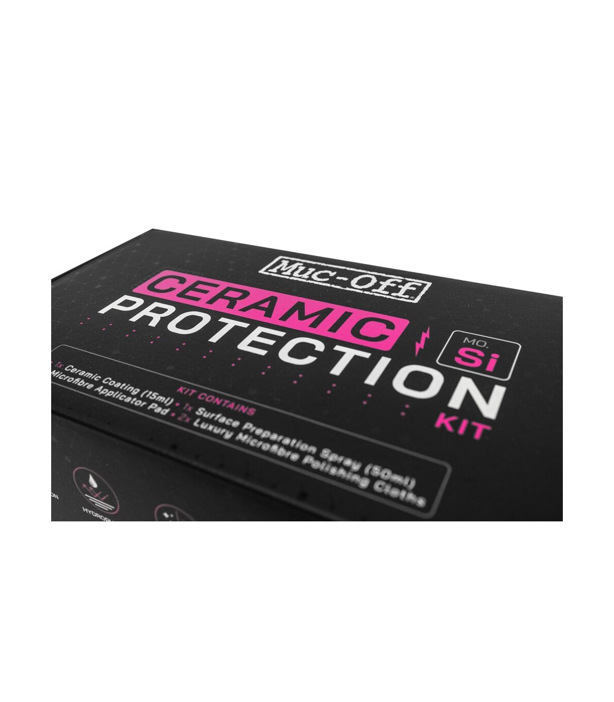 Ceramic Protection KitQuick and easy application.Paint gloss enhancement.Industry-leading slickness.Dirt and grime repellence.UV Protection.Water shedding and hydrophopic properties.Liquid repellence providing a water contact angle of between 100°- 110°9H Scratch resistance.Chemical resistance.Durable - Can lasting up to 2 years on surfaces. (Ensuring you follow all preparation, application and maintenance instructions included on the packaging.)Perfect for Bicycles, E-Bikes, Motorcycles, Cars, ATV's and more.Suitable for gloss and matt finishes. (After curing it will give a richer and darker colour tone on matt finishes.)Can be used on paintwork, carbon fiber, metal components, wheels, vinyl and rigid plastic trim.Makes cleaning and maintenance a breeze. What is included in the Kit:1 x 15ml Ceramic Coating1 x 50ml Surface Preparation Spray1 x Microfibre Applicator Pad2 x Luxury Microfibre Buffing ClothsHow To Use:PREPARING THE SURFACE1. Thoroughly wash your bike using Nano Tech Bike Cleaner, Punk Powder or Snow Foam, then ensure it is completely dry before starting the coating process.2. Depending on the condition of the paint or surface, perform the appropriate level of paint correction to remove any defects including swirl marks, water spots, and scratches. Keep in mind this product is very durable and will seal in any imperfections.3. Remove any excess paint correction or wax/polish residue by wiping all painted surfaces with surface prep spray. Simply spray onto the microfibre cloth and wipe down.CERAMIC COATING APPLICATION1. We recommend applying the coating in a cool, dry, clean area, inside with good lighting and ventilation. For non-factory finishes test a small inconspicuous area prior to full coverage.2. Shake the bottle thoroughly for 10 seconds to activate the formula.3. We recommend wearing protective gloves when applying the coating.4. Unscrew the child-resistant cap, then apply the coating sparingly and evenly along the provided micro?ber applicator pad. (A little coating goes a long way).5. Starting at the highest surfaces, work in a crosshatch #, overlapping pattern to ensure all areas are coated. We recommend limiting application areas to the approximate size of 1 bike tube/panel at a time. Relax and take your time, applying slowly and carefully for the best results.6. Add additional coating to the applicator pad when the coating is not being applied evenly and or the applicator does not glide over the surface smoothly.7. Allow the wet coating to cure for 5 minutes. During this time the coated surface will develop a rainbow-like appearance. In this time check that you have covered all areas. Using the provided micro?ber cloth, lightly bu? the surface using small circular motions to a high gloss, mirror-like ?nish. Be sure to check the surface in multiple light angles to ensure all the rainbow e?ect has been removed. Do not allow the wet coating to cure for longer than 5 minutes and ensure it has all been buffed off.8. Once buffed off, let the coating fully cure for 24 hours in a cool dry place before exposing it to water or the elements. (For best results and adhesion, we do not recommend washing for at least 48 hours after application).9. You can easily layer up the coating with a second application for even longer durability, simply follow the costing application instructions above after the first layer has fully cured. You do not need to re-prep.10. Use within 6 months once opened11. Go ride!MAINTENANCE/CLEANING1. In order to properly maintain your ceramic coating, we would only recommend cleaning using our Nano Tech Bike Cleaner, Punk Powder, or Snow Foam. Avoid using other solvents or acidic cleaners as these will break down the coating much quicker.2. Keeping the surface clean will ensure you retain the hydrophobic properties of the coating.3. If you notice the surface starts to lose some of the hydrophobic water-beading properties over time you can simply top up and refresh the coating. We recommend a top-up every 6 months to maintain optimal performance.