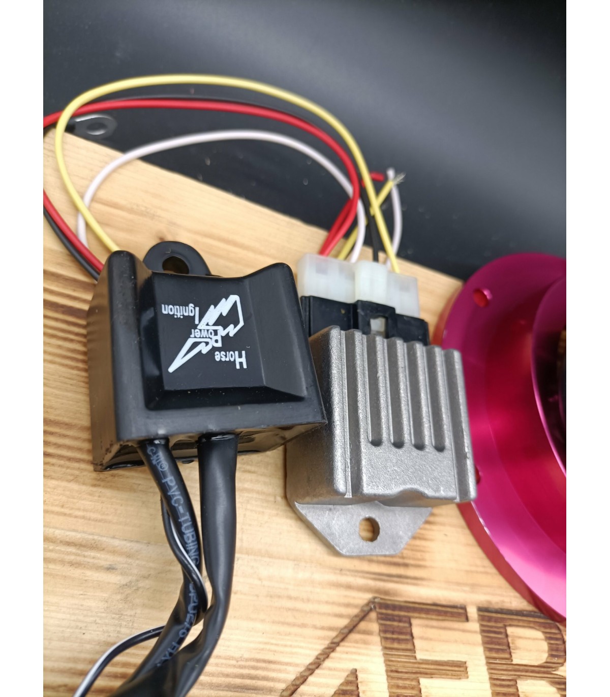 Puissance de sortie suffisante pour alimenter le CDI et supprimer la batterie, tout en maintenant un +12V stable via le régulateur (régulateur fourni branchement a prévoir).