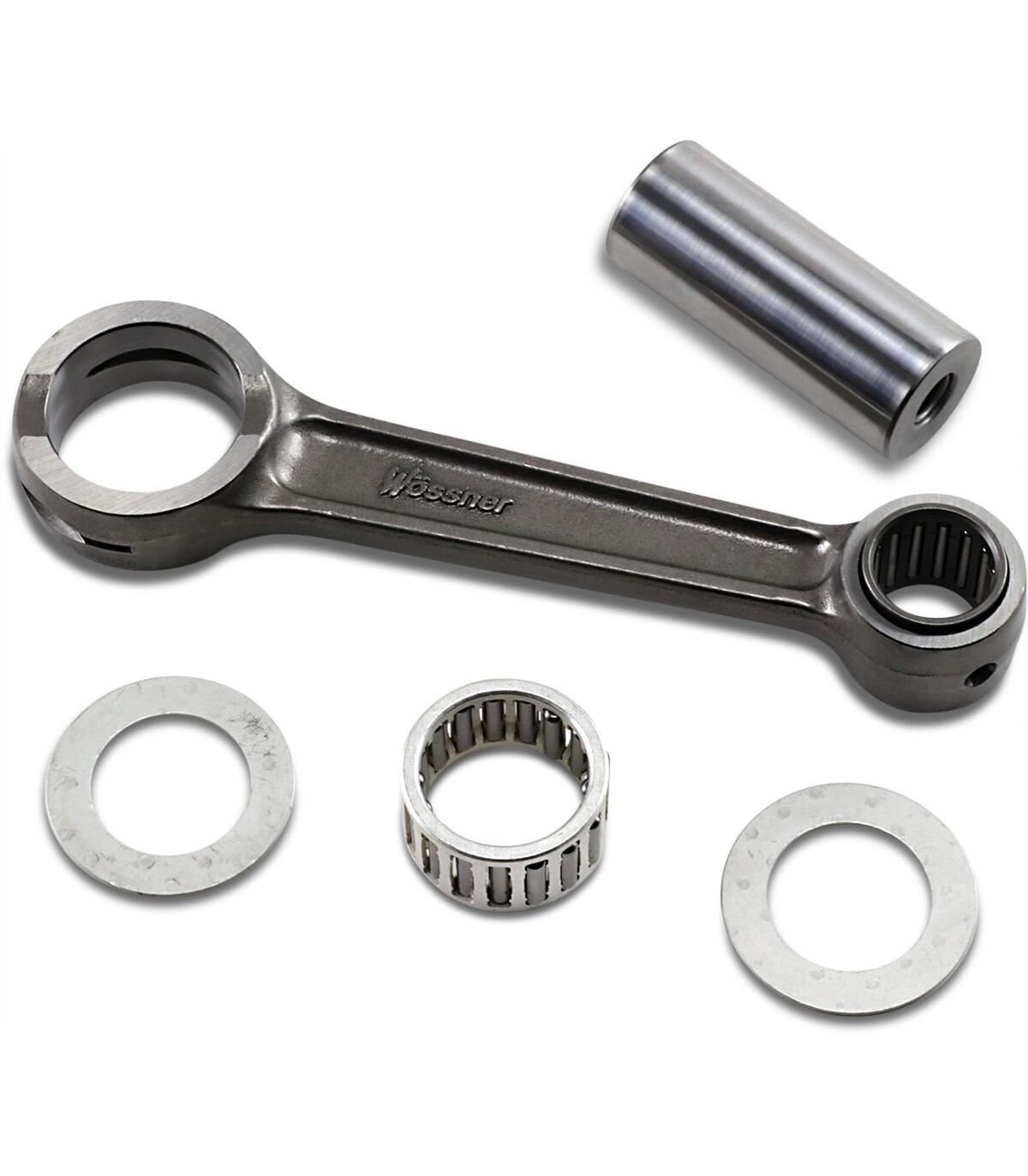 Connecting Rod Kit for 2-StrokeDesigned to fit OEM bearing and crank pinShot peened for ultimate strength and long life8620 forged alloyFEA (computer simulation) used to fine tune every designGerman engineeredFor best results use corresponding Wössner piston kit.Kit includes connecting rod, bearing, big end pin, top end bearing, and washers