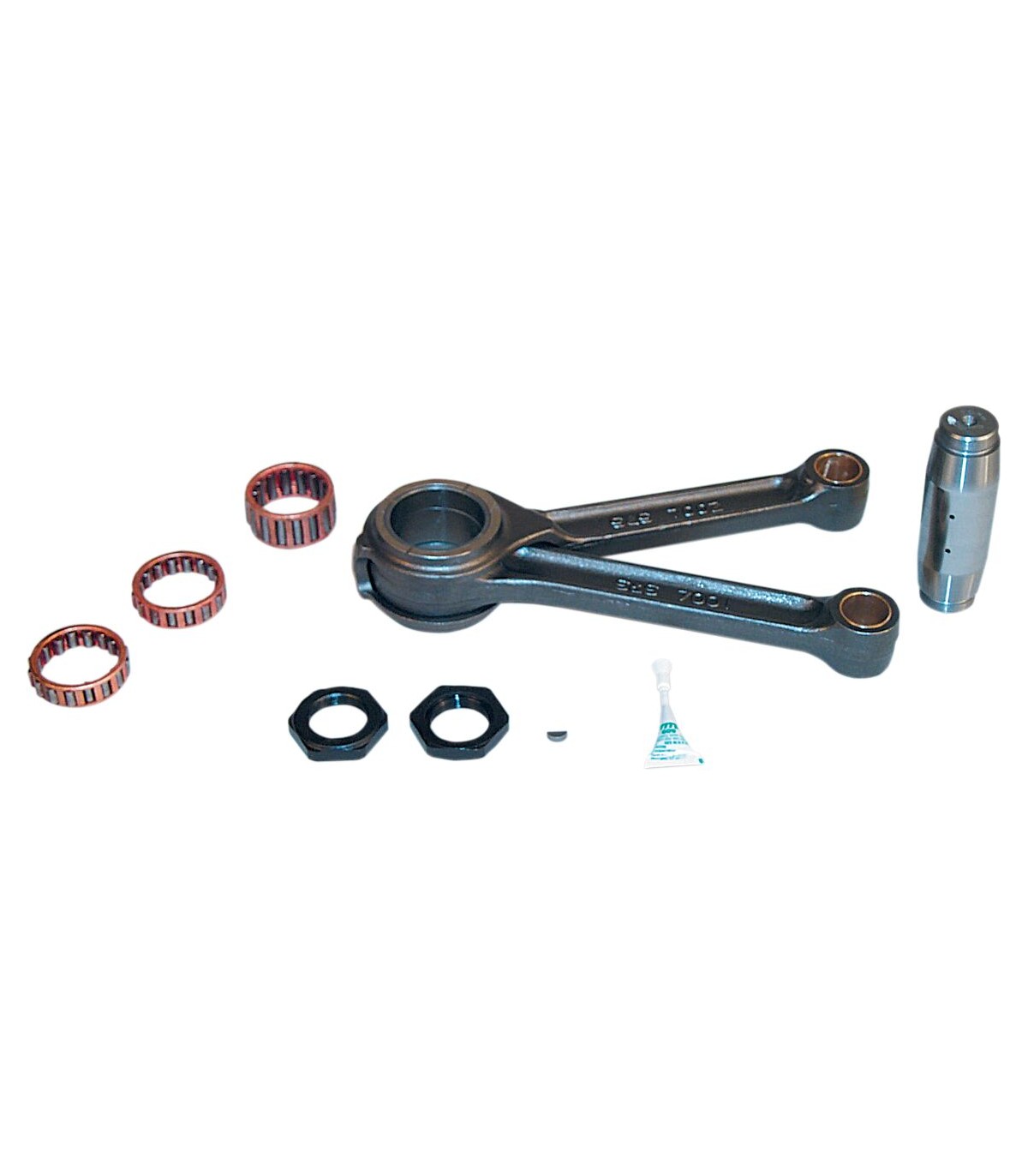 équipement et il est fourni prêt à installerLe kit comprend les bielles avant et arrière, un maneton et des écrous, des cages en acier et des roulements à rouleauxLe maneton comprend deux perçages pour la lubrification et quatre entailles de chaque côté des manetons pour maintenir un film d'huile sur les surfaces de frictionLes bielles sont forgées et traitées thermiquement, elles sont 0,120” plus larges que les pièces d’origine au niveau de la section en I et elles comprennent un jeu entre les bielles pour permettre des courses de jusqu’à 5”Fabrication aux États-UnisPour pouvoir installer des kits bielle, un espacement supplémentaire des volants et des carters peut s’avérer nécessaire.Wrist pin is .792" and length is 7.440"