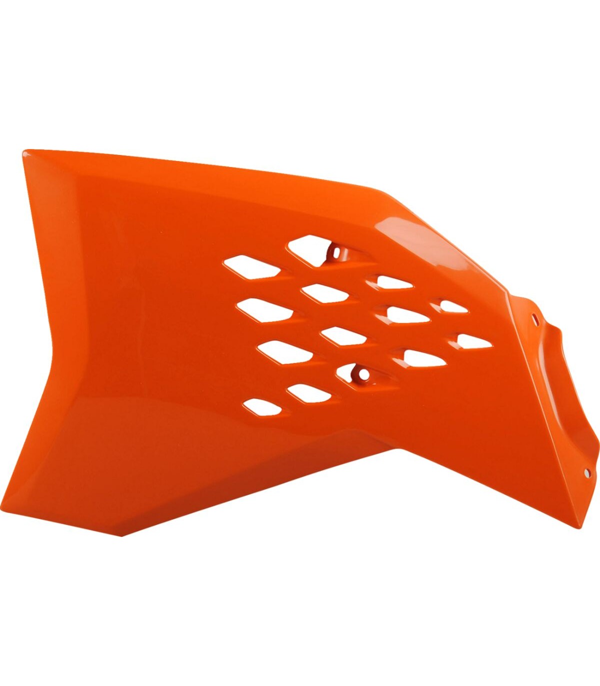 Radiator Covers For KTM IPD (in-mold plastic decals) and DGP(durable gloss propylene)Injection-molded, quality plastic components with a perfect OEM fitExact replica of stock OEM plastic components but strongerInexpensive alternative to OEM replacement partsStock color match with less fadeGlossy and flexibleImpact and abrasion resistantLess prone to scratching or marking