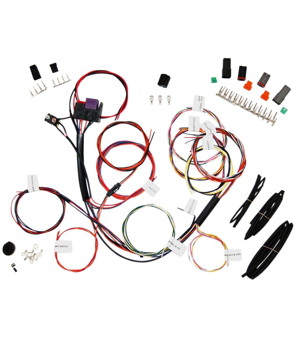 Faisceau de câblage moto complet avec relais de démarreur et 3 circuitsLe bloc de fusibles contient un relais de démarreur pleine taille communément disponible et remplaçable, ainsi que (3) fusibles ATOUn coupe-circuit de 30 A est installé, et prêt à accueillir n'importe quel régulateur/système de chargeCâblage des témoins suivants : huile, neutre, phare et clignotantCâblage du contacteur de guidon de couleur identique à celui des modèles 96-13 Non-Glide pour contacteur ROUTE/CROISEMENT, KLAXON, DÉMARRAGE et COUPE-CIRCUIT uniquementCâblage de phare, avec support de phare et raccordsFaisceau de feu de garde-boue arrière avec connecteurs et raccordsSections de gaine thermorétractable de 4,76 mm (0,1875 pouce), 6,35 mm (0,25 pouce), 9,53 mm (0,375 pouce) et 12,7 mm (0,5 pouce) de diamètre intérieur incluses