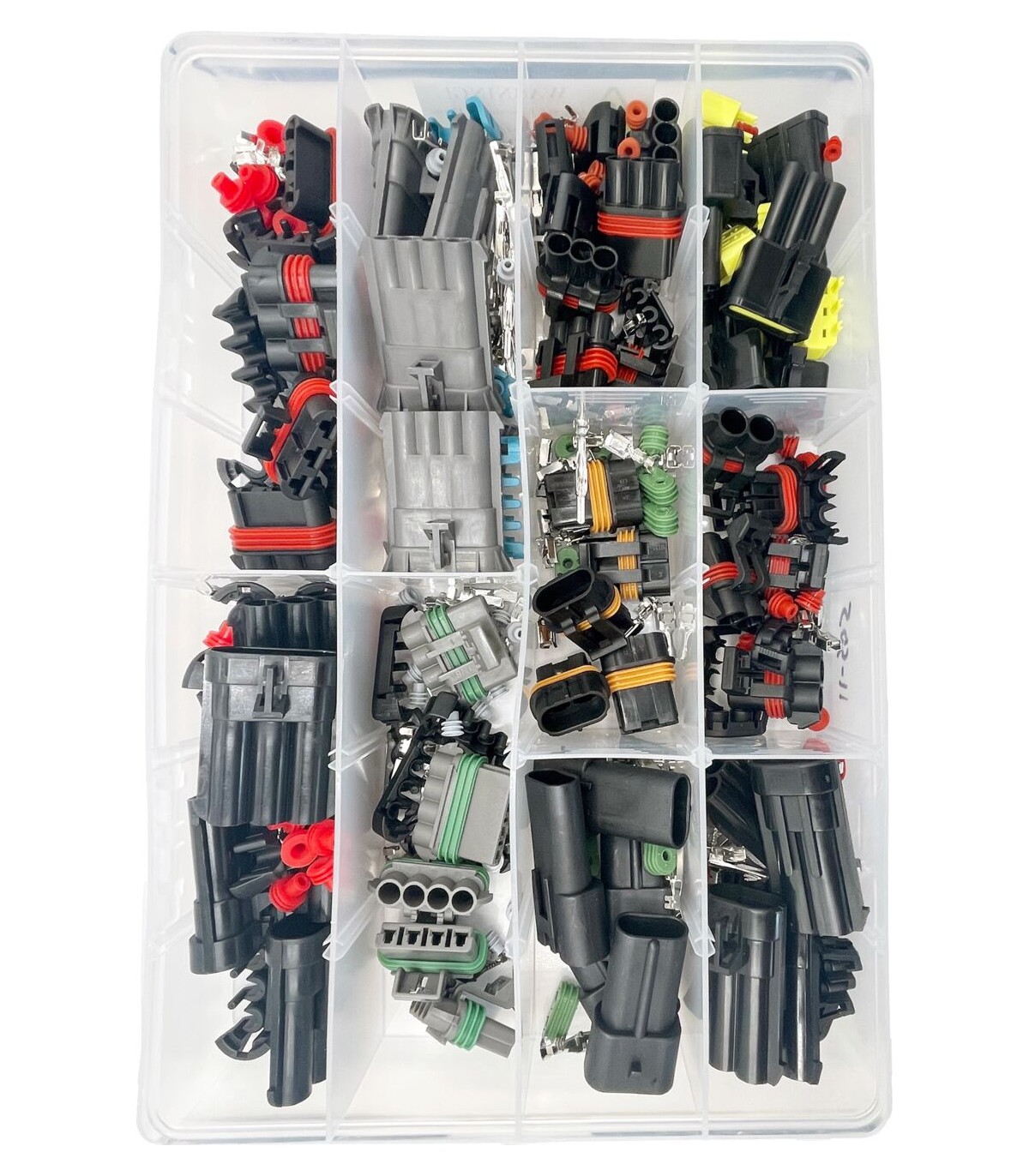 Universal Connector KitUniversal connector kit made up of heavy duty Delphi water proof connectors and terminalsIncludes 2 place, 3 place, and 4 place male and female crimp style connectorsWorks with 12-16 gauge wire