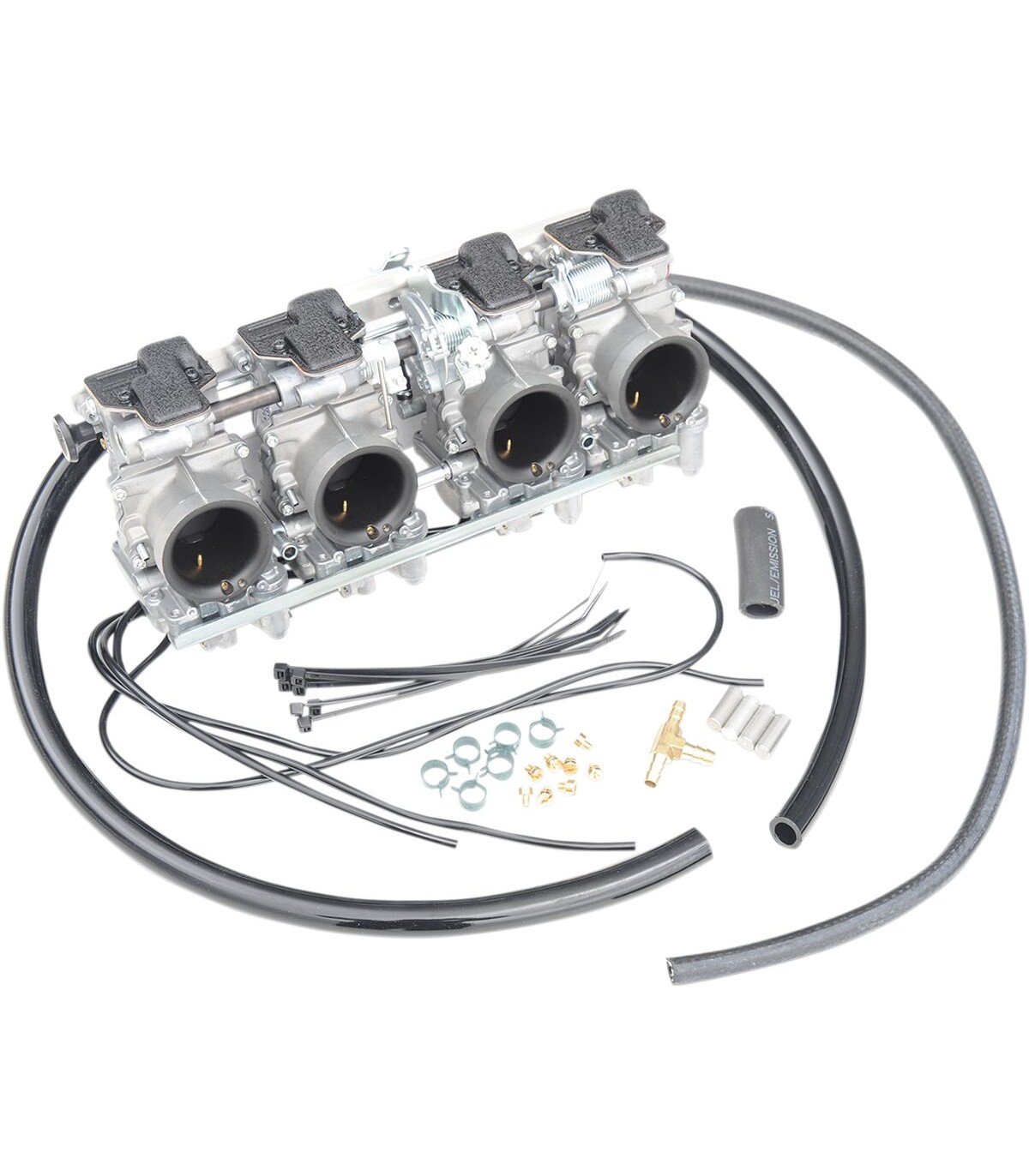 Rampe de carburateur radial à plat série RSConçue pour une performance à quatre cylindres en ligne afin d'offrir un gain de puissance aux meilleures motos de course sur circuit et de course de vitesseRéponse à l'accélérateur douce et contrôlable avec une mesure précise de l'essence et un volume essence/air élevé requis par les moteurs de courseLa conception plate de la soupape d'accélérateur offre un meilleur signal pour une réponse à l'accélérateur précise et instantanéeLa buse de pompe de reprise envoie le carburant directement dans l'ailette d'entrée d'air pour une réponse immédiate du moteurVérifiez l'espacement du carburateur afin de contrôler les ajustements ; utilisez un tableau d'espacement pour cette vérificationLa ventilation de la cuve permet à la pression atmosphérique d'entrer dans la cuve pour le débit de l'essencePompe accélérateur ajustable et vis de ralenti ajustable inclusesLe ressort de câble de retour ajustable permet une pression de retour du ressortSystème de démarreur enrichi inclus pour un démarrage à froid plus facileL'aiguille est dotée de rainures d'ajustement simples pour un réglage rapideFabrication au JaponDes modifications au niveau du gicleur pourraient être nécessaires par application, voir le tableau pour les gicleurs concernésUne bonde d'un plus grand diamètre extérieur pourrait nécessiter différentes brides de fixation