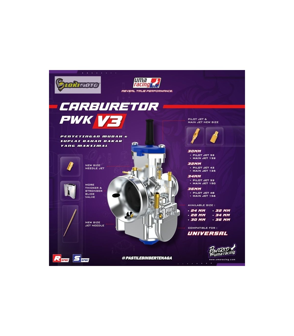 Le PWK Flat-D Uma Racing est disponible en plusieurs diamètres pour s’adapter à toutes les configurations moteur :