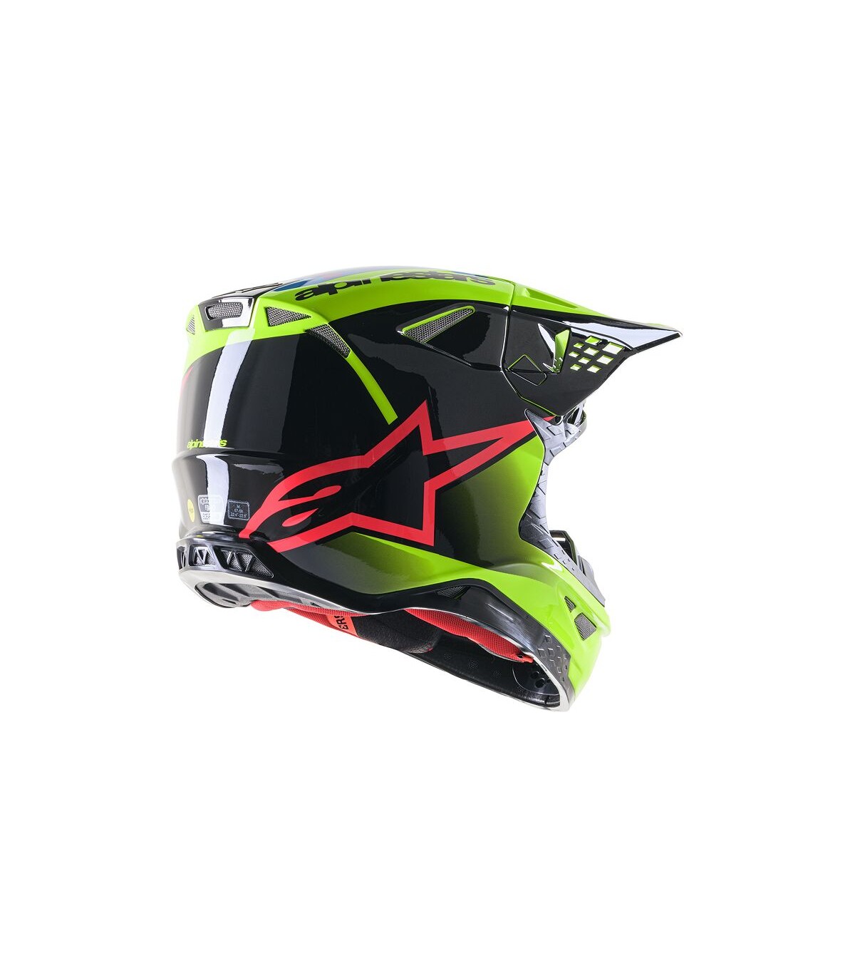 Supertech M10 Unite HelmetThe S-M10 shell sizing solution ensures each helmet fit size has its own appropriate shell size to deliver the most anatomical solution for the wide variety of fit needs, thus ensuring riders have the correct fit to improve comfort, reduce overall weight, and improve effectiveness of the helmet in an impact.Surface curvature promotes reduced friction on impact, allowing deflection and transfer of energy to protect the rider's head from direct force to the skull and referred to the neck and spinal column.The S-M10's design offers a smooth, attractive, aerodynamic profile which is streamlined and free of any external channels and features that might act as a load point in an impact or compromise the overall integrity of the helmet's construction.Fitted with E-2, last generation of MIPS, integrated low friction layer designed to reduce rotational motion transferred to the brain from angled impacts to the head.Chin bar's base area specifically sculpted to give a relief section and raised to clear the collarbone.Soft EPS liner extends beyond the helmet shell itself and is covered by a flexible rubber compound providing a reduced chance of any sort of collarbone injury.A-Head Fitment System allows easy adjustment of the angle and height that the helmet sits on the head.Ultra-ventilated helmet with 28 individual intake and exhaust ports, not including the eye port, with 18 intakes and 10 exhausts.Rotational acceleration and oblique impact performance.Eject technology includes the eject helmet removal system.Removable side pads, made from a semi-soft polymer for added protection, provide contact area to help spread impact energy.Emergency Release System (ERS) Emergency Visor Release and Visor Extension provides protection.