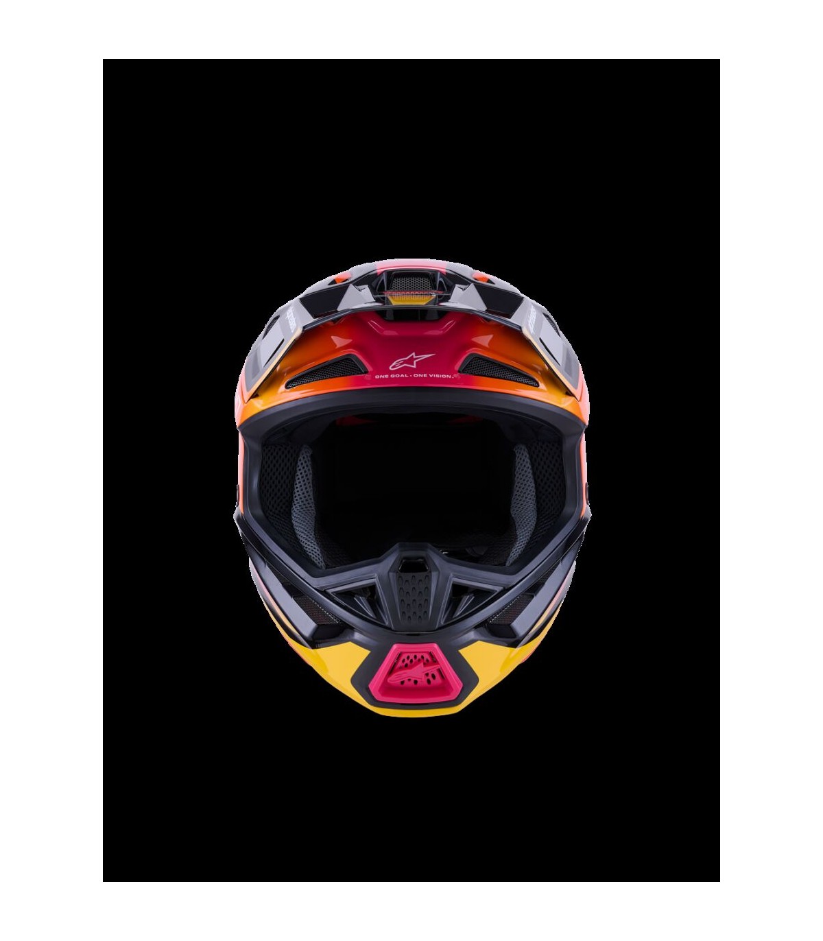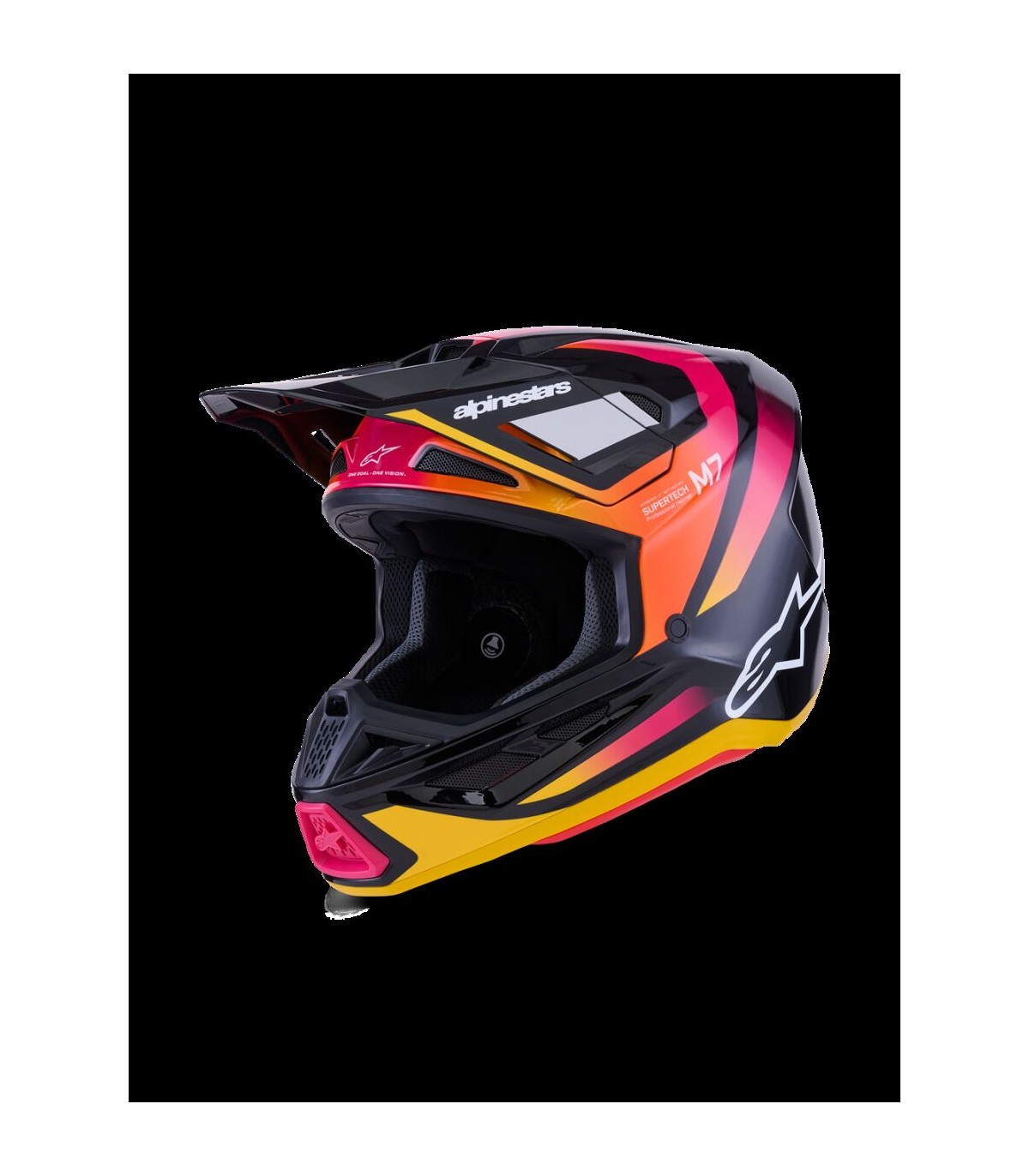 SM7 Rise HelmetThe SM7 helmet is engineered for off-road racing combining impact protection and comfort.Outer shell composite construction is lightweight and durable.Outer shell's aerodynamic profile has been designed reduce friction on impact, allowing deflection and the most efficient transfer of energy to protect the rider's head from direct force, referred to the neck and spinal column.Thanks to 20 individual intake and exhaust ports, not including the eye port, with 13 intakes and 8 exhausts this helmet is ultra-ventilated. Patented visor detaching system is engineered to automatically detach visor from the shell when subjected to an impact energy greater than 15 joules for optimum impact protection, regardless of the direction.Alpinestars patented Plasma technology is strategically-integrated into the SM7's side pads for high performance shock absorption in critical area to reduce the risk of injuries significantly. Linings are removable and washable.The Cheek Pads are fitted 3D foam, with an emergency extraction system (ERS), with a channel for hydration tube installation. Cheek pads are interchangeable among all sizes.Crown Pad and the Neck Pad are elastically connected, for better oblique impact management.Top Pad is removable and adjustable in height thanks to the A-head system.Chin strap is fitted with a 25 mm width nylon strap, stainless steel DD rings, removable covers for washing purpose.Shell sizing solution ensures each helmet fit size has its own appropriate shell size to deliver the most anatomical fit.Three different helmet shell sizes M, L and XL, and 6 consumer sizes from XS to XXL to ensure correct fit. Improving comfort, effectiveness of the helmet in an impact and reducing overall weight.Fit can further be customized via Alpinestars genuine replacement cheekpads available in all thicknesses and are exchangeable between all shell sizes.Both sides have integrated channels to accommodate hydration system.Communication system compatible thanks to cutaway section on the left-side of the EPS to seamlessly accommodate Intercom Systems, with earphone recesses on both sides for speakers.