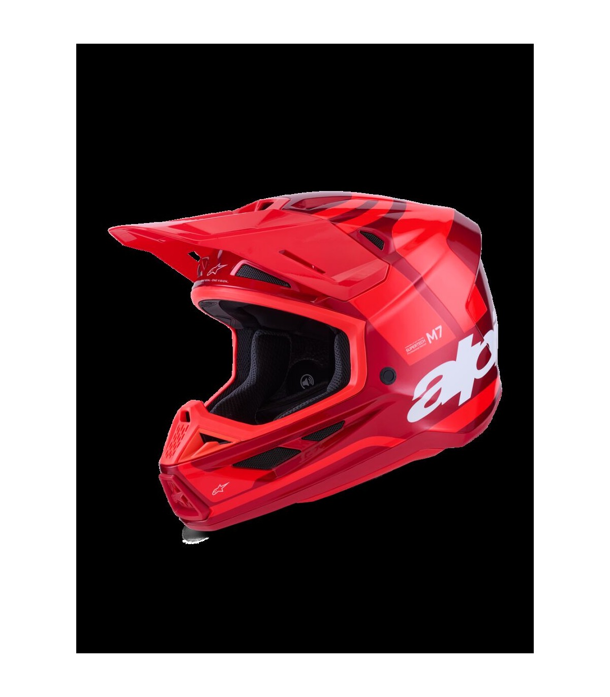 SM7 Core HelmetThe SM7 helmet is engineered for off-road racing combining impact protection and comfort.Outer shell composite construction is lightweight and durable.Outer shell's aerodynamic profile has been designed reduce friction on impact, allowing deflection and the most efficient transfer of energy to protect the rider's head from direct force, referred to the neck and spinal column.Thanks to 20 individual intake and exhaust ports, not including the eye port, with 13 intakes and 8 exhausts this helmet is ultra-ventilated. Patented visor detaching system is engineered to automatically detach visor from the shell when subjected to an impact energy greater than 15 joules for optimum impact protection, regardless of the direction.Alpinestars patented Plasma technology is strategically-integrated into the SM7's side pads for high performance shock absorption in critical area to reduce the risk of injuries significantly. Linings are removable and washable.The Cheek Pads are fitted 3D foam, with an emergency extraction system (ERS), with a channel for hydration tube installation. Cheek pads are interchangeable among all sizes.Crown Pad and the Neck Pad are elastically connected, for better oblique impact management.Top Pad is removable and adjustable in height thanks to the A-head system.Chin strap is fitted with a 25 mm width nylon strap, stainless steel DD rings, removable covers for washing purpose.Shell sizing solution ensures each helmet fit size has its own appropriate shell size to deliver the most anatomical fit.Three different helmet shell sizes M, L and XL, and 6 consumer sizes from XS to XXL to ensure correct fit. Improving comfort, effectiveness of the helmet in an impact and reducing overall weight.Fit can further be customized via Alpinestars genuine replacement cheekpads available in all thicknesses and are exchangeable between all shell sizes.Both sides have integrated channels to accommodate hydration system.Communication system compatible thanks to cutaway section on the left-side of the EPS to seamlessly accommodate Intercom Systems, with earphone recesses on both sides for speakers.