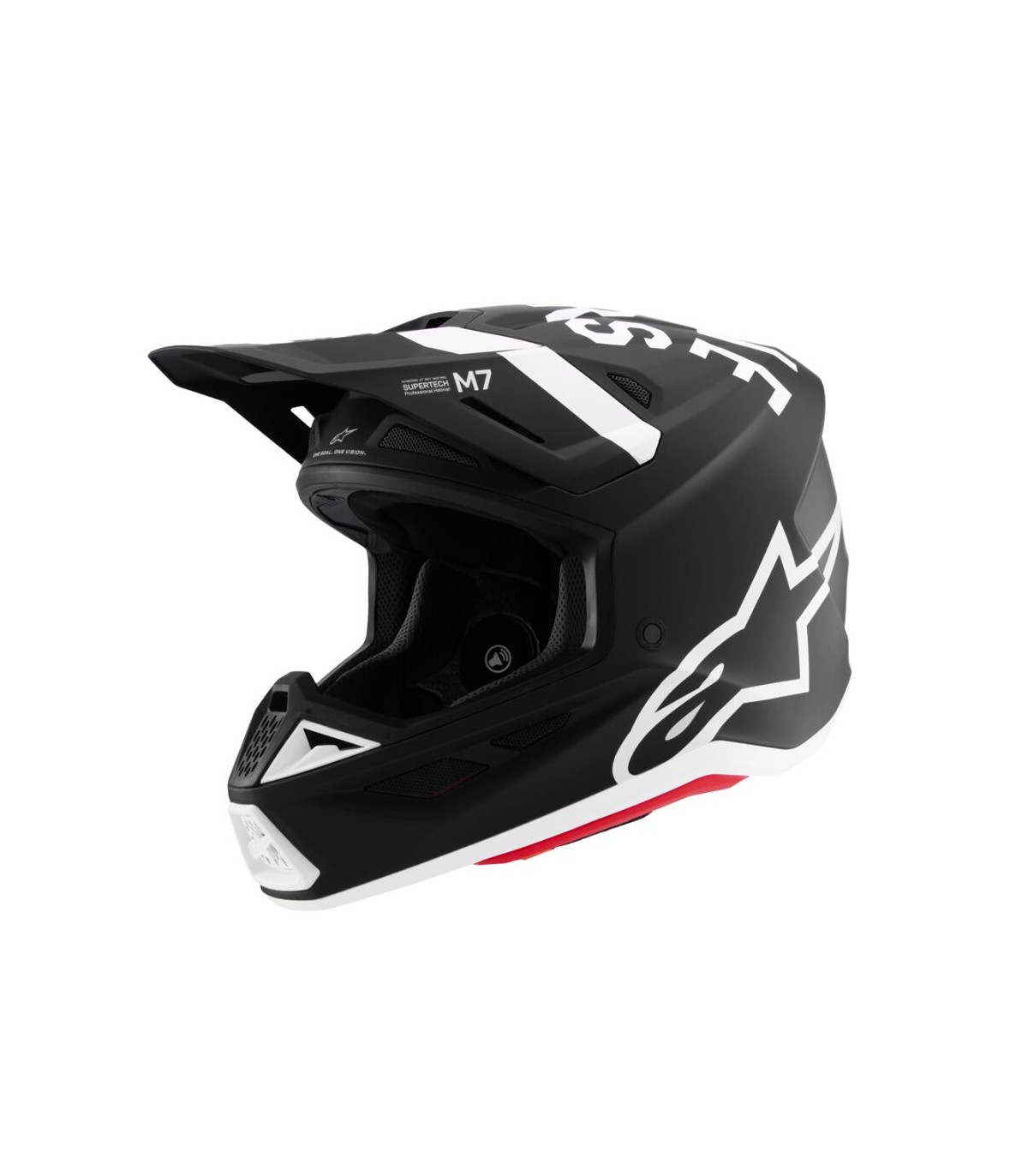 SM7 Dasher HelmetThe SM7 helmet is engineered for off-road racing combining impact protection and comfort.Outer shell composite construction is lightweight and durable.Outer shell's aerodynamic profile has been designed reduce friction on impact, allowing deflection and the most efficient transfer of energy to protect the rider's head from direct force, referred to the neck and spinal column.Thanks to 20 individual intake and exhaust ports, not including the eye port, with 13 intakes and 8 exhausts this helmet is ultra-ventilated. Patented visor detaching system is engineered to automatically detach visor from the shell when subjected to an impact energy greater than 15 joules for optimum impact protection, regardless of the direction.Alpinestars patented Plasma technology is strategically-integrated into the SM7's side pads for high performance shock absorption in critical area to reduce the risk of injuries significantly. Linings are removable and washable.The Cheek Pads are fitted 3D foam, with an emergency extraction system (ERS), with a channel for hydration tube installation. Cheek pads are interchangeable among all sizes.Crown Pad and the Neck Pad are elastically connected, for better oblique impact management.Top Pad is removable and adjustable in height thanks to the A-head system.Chin strap is fitted with a 25 mm width nylon strap, stainless steel DD rings, removable covers for washing purpose.Shell sizing solution ensures each helmet fit size has its own appropriate shell size to deliver the most anatomical fit.Three different helmet shell sizes M, L and XL, and 6 consumer sizes from XS to XXL to ensure correct fit. Improving comfort, effectiveness of the helmet in an impact and reducing overall weight.Fit can further be customized via Alpinestars genuine replacement cheekpads available in all thicknesses and are exchangeable between all shell sizes.Both sides have integrated channels to accommodate hydration system.Communication system compatible thanks to cutaway section on the left-side of the EPS to seamlessly accommodate Intercom Systems, with earphone recesses on both sides for speakers.