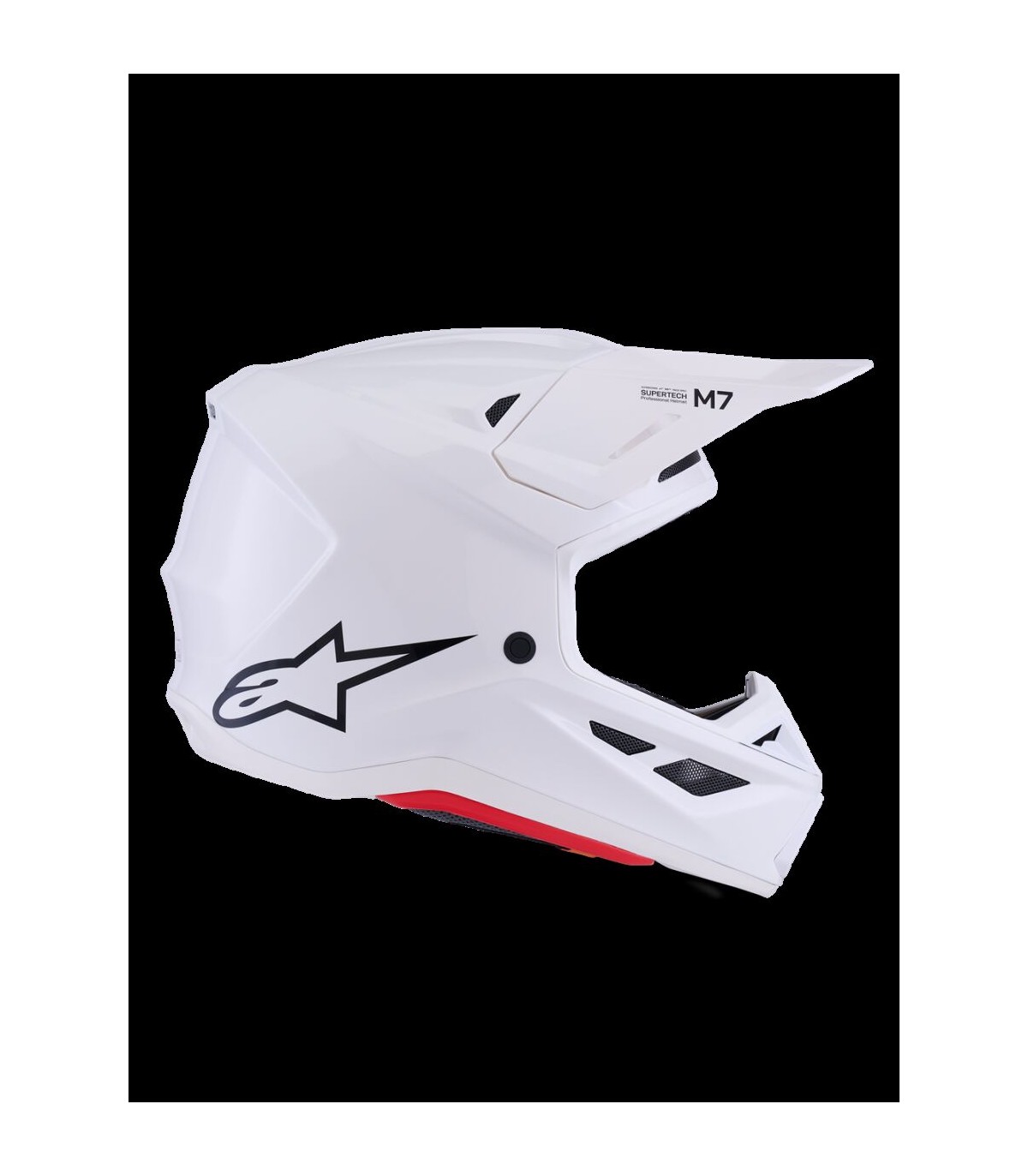 SM7 HelmetThe SM7 helmet is engineered for off-road racing combining impact protection and comfort.Outer shell composite construction is lightweight and durable.Outer shell's aerodynamic profile has been designed reduce friction on impact, allowing deflection and the most efficient transfer of energy to protect the rider's head from direct force, referred to the neck and spinal column.Thanks to 20 individual intake and exhaust ports, not including the eye port, with 13 intakes and 8 exhausts this helmet is ultra-ventilated. Patented visor detaching system is engineered to automatically detach visor from the shell when subjected to an impact energy greater than 15 joules for optimum impact protection, regardless of the direction.Linings are removable and washable.Alpinestars patented Plasma technology is strategically-integrated into the SM7's side pads for high performance shock absorption in critical area to reduce the risk of injuries significantly. The Cheek Pads are fitted 3D foam, with an emergency extraction system (ERS), with a channel for hydration tube installation. Cheek pads are interchangeable among all sizes.Crown Pad and the Neck Pad are elastically connected, for better oblique impact management.Top Pad is removable and adjustable in height thanks to the A-head system.Chin strap is fitted with a 25 mm width nylon strap, stainless steel DD rings, removable covers for washing purpose.Shell sizing solution ensures each helmet fit size has its own appropriate shell size to deliver the most anatomical fit.Three different helmet shell sizes M, L and XL, and 6 consumer sizes from XS to XXL to ensure correct fit. Improving comfort, effectiveness of the helmet in an impact and reducing overall weight.Fit can further be customized via Alpinestars genuine replacement cheekpads available in all thicknesses and are exchangeable between all shell sizes.Both sides have integrated channels to accommodate hydration system.Communication system compatible thanks to cutaway section on the left-side of the EPS to seamlessly accommodate Intercom Systems, with earphone recesses on both sides for speakers.
