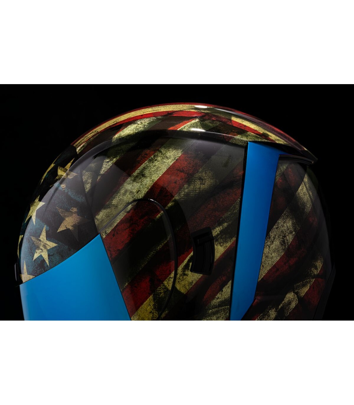 Casque Airform™ Old GloryCoque en polycarbonate moulé pour plus de soliditéGéométrie du flux d’air interneSystème de ventilation en continuTour de cou sculptéVisière ICON Optics™ anti-buée avec mécanisme Rapid-Release™Système de verrouillage sécurisé de visière Prolock™Visière Dropshield™ interne avec bouton à l’extérieurLa visière DropShield™ ne doit être utilisée que lorsque l’accessoire frontal de casque est complètement fermé.Cache-nez moulé amovibleDoublure Hydradry™ anti-humidité en trois pièces amoviblePoches de haut-parleur internes compatibles avec l'appareil R.A.U. Bluetooth d’ICONBrille dans l’obscuritéAvec visières Optics™ transparente et RST bleueVisière Dropshield™ fumé foncé incluse