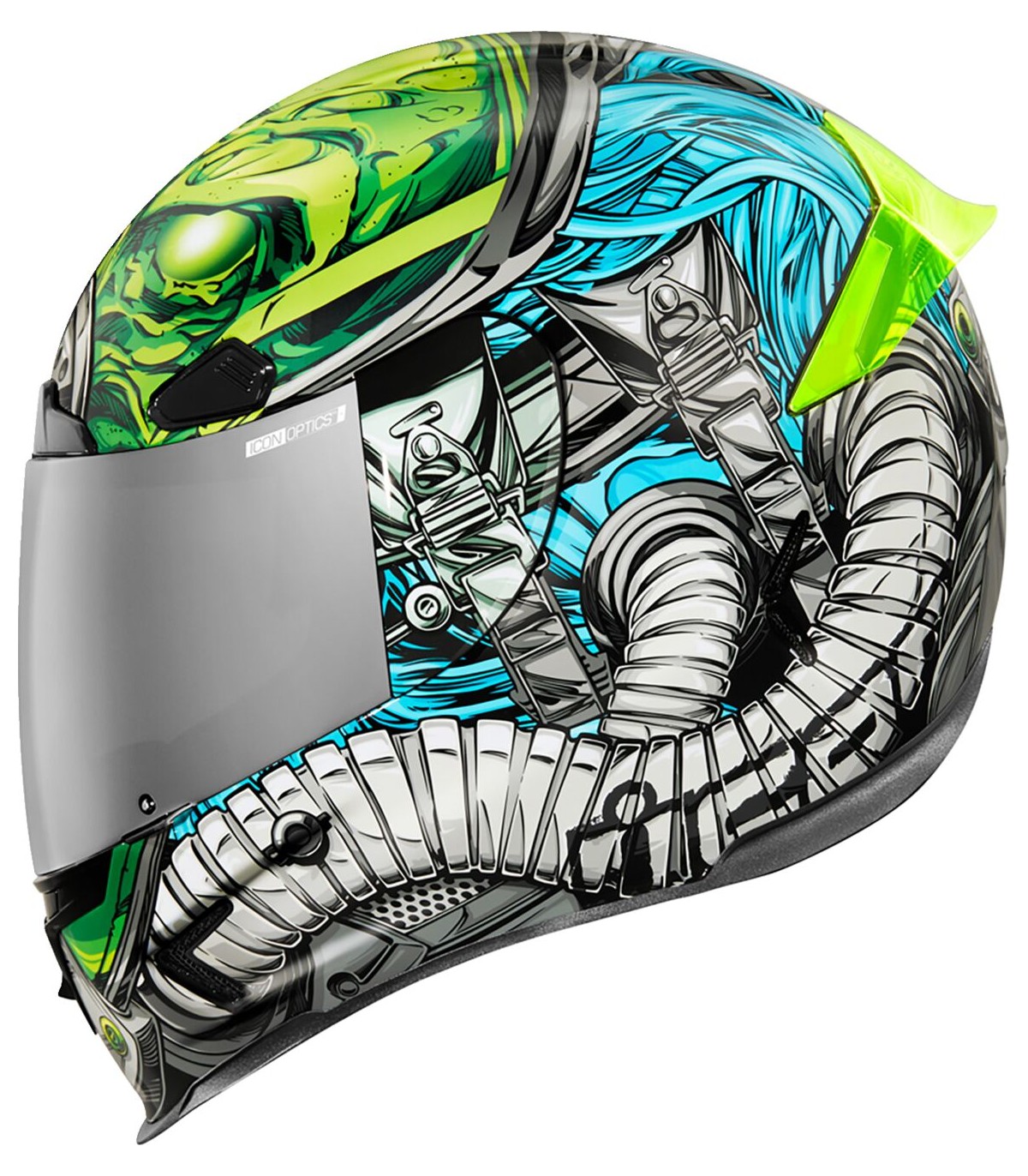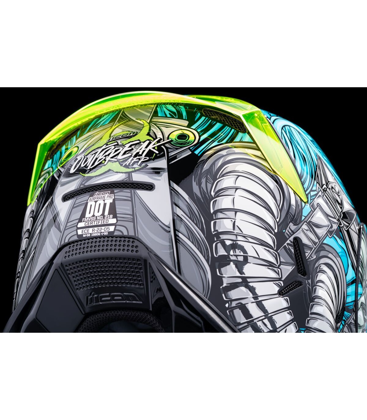 Casque Airframe Pro™ OutbreakAérations discrètes sur toute la coqueTour de cou sculpté empêchant au mieux le contact avec la veste/combinaisonVisière ICON Optics™ anti-buée avec mécanisme Rapid-Release™Aérations dans la doublure à hauteur du frontSystème de verrouillage sécurisé de visière Prolock™Sous-casque modulaire à cinq pièces avec technologie anti-humidité Hydradry™Cache-nez et mentonnière amoviblesCoque en plastique renforcé de fibre de verre fabriquée à la mainAvec visières Optics™ ICON transparente et RST argent