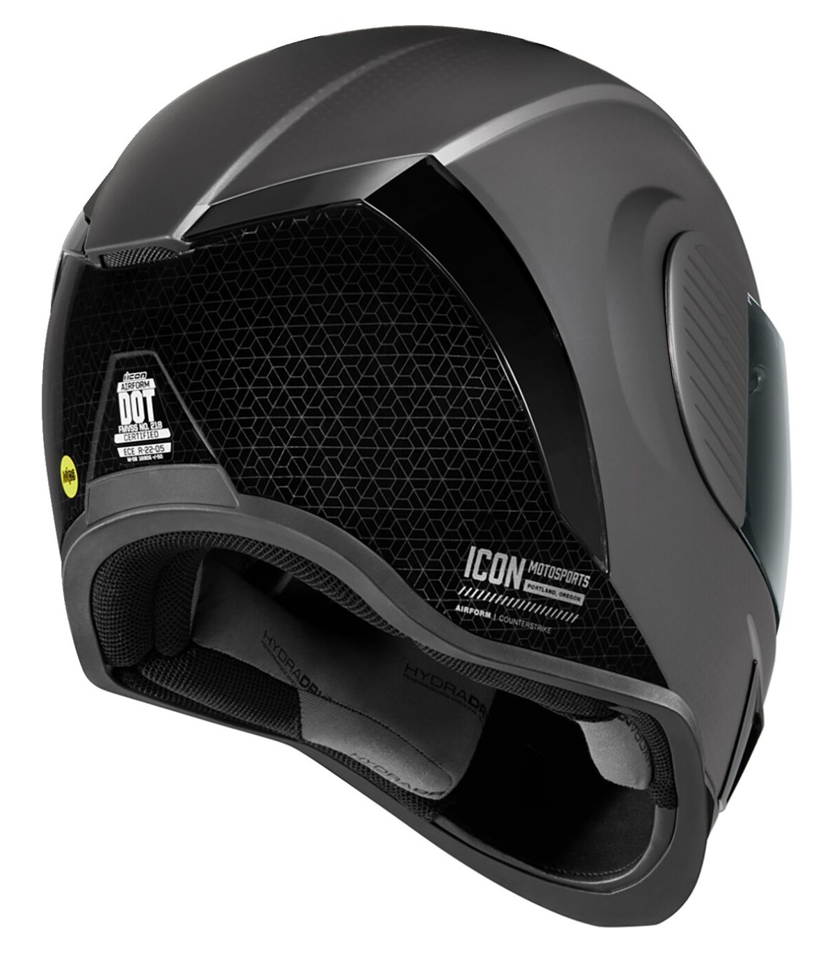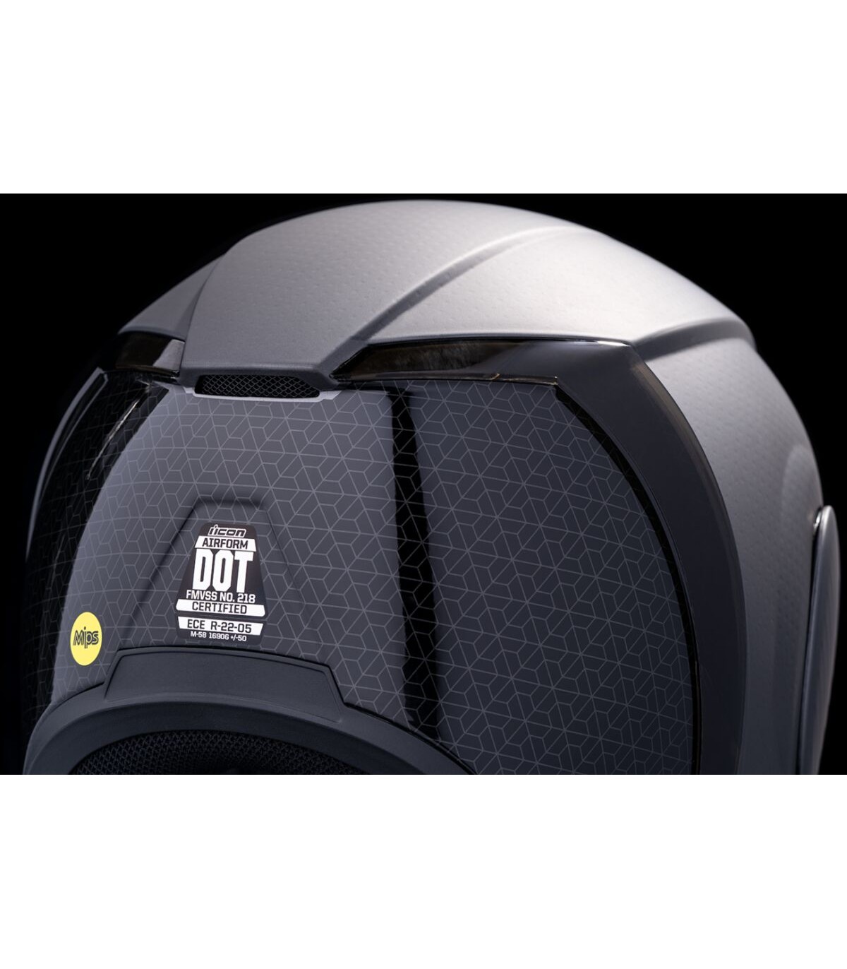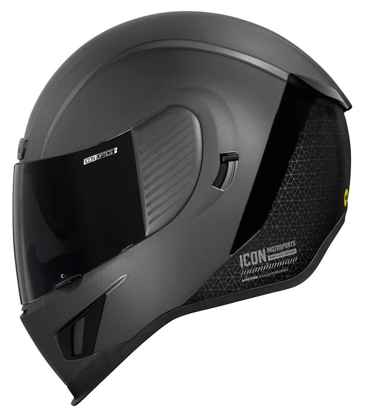 Casque Airform™ Counterstrike MIPS®Coque en polycarbonate moulé pour plus de soliditéSystème de verrouillage sécurisé de visière Prolock™Système de ventilation en continuVisière ICON Optics™ anti-buée avec mécanisme Rapid-Release™Tour de cou sculptéGéométrie du flux d’air interneVisière Dropshield™ interne avec bouton à l’extérieurLa visière DropShield™ ne doit être utilisée que lorsque l’accessoire frontal de casque est complètement fermé.Cache-nez moulé amovibleDoublure Hydradry™ anti-humidité en trois pièces amoviblePoches de haut-parleur internes compatibles avec l'appareil R.A.U. Bluetooth d’ICONVisières ICON Optics™ transparente et fumé foncé comprisesVisière Dropshield™ fumé foncé incluseChin Vent™ noir pour Airform également inclus