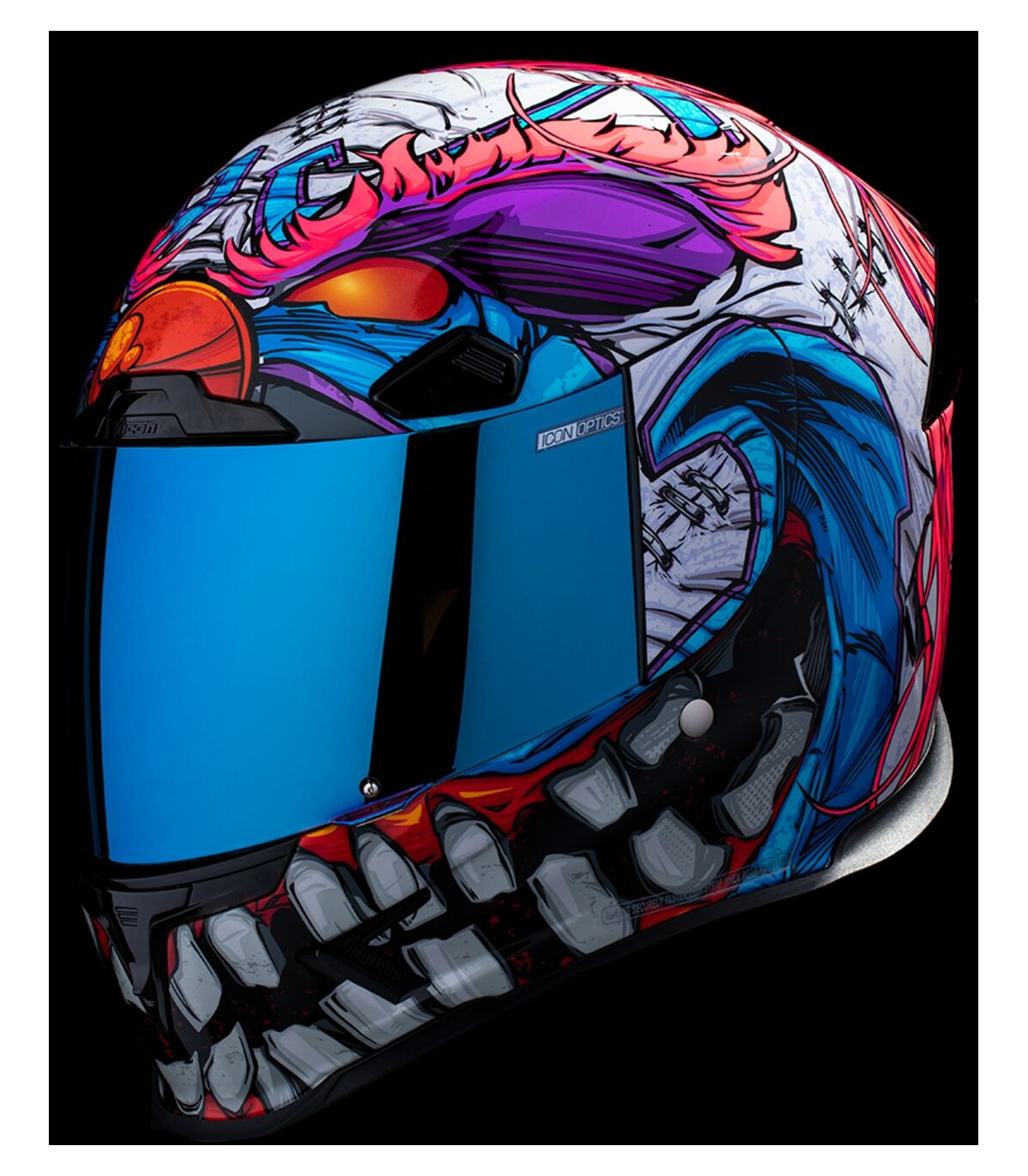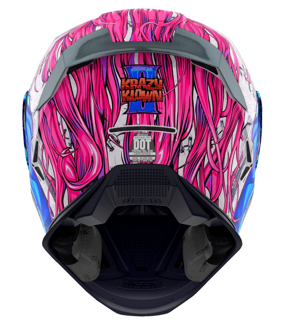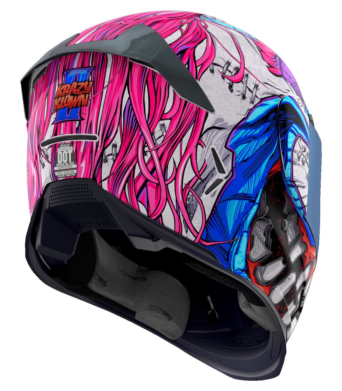 Casque Airframe Pro™ Krazy Klown 2Tour de cou sculpté empêchant au mieux le contact avec la veste/combinaisonSystème de verrouillage sécurisé de visière Prolock™Sous-casque modulaire à cinq pièces avec technologie anti-humidité Hydradry™Visière ICON Optics™ anti-buée avec mécanisme Rapid-Release™Aérations discrètes sur toute la coqueAérations dans la doublure à hauteur du frontCache-nez et mentonnière amoviblesCoque en plastique renforcé de fibre de verre fabriquée à la main