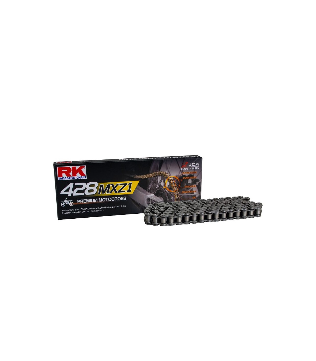 Chaîne de transmission 428 MXZ1Chaîne renforcée pour usage intensif en motocrossLes chaînes de la série RK MXZ ont une structure en acier chromé, avec des rouleaux et des bagues sans soudures.